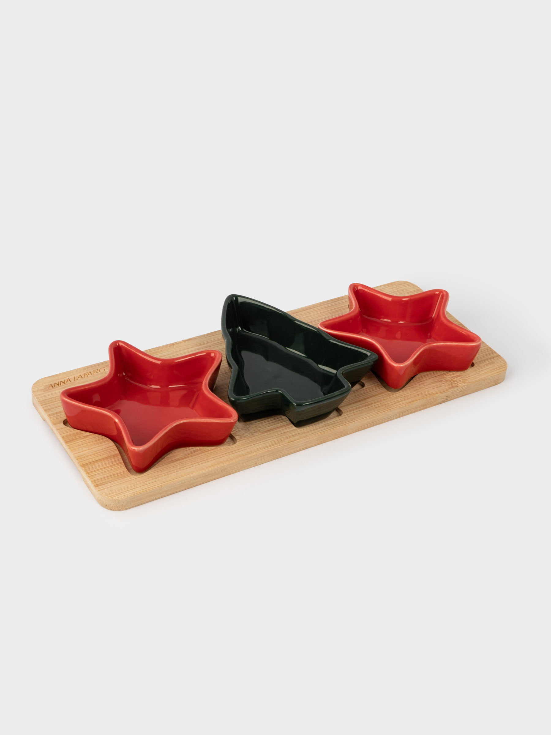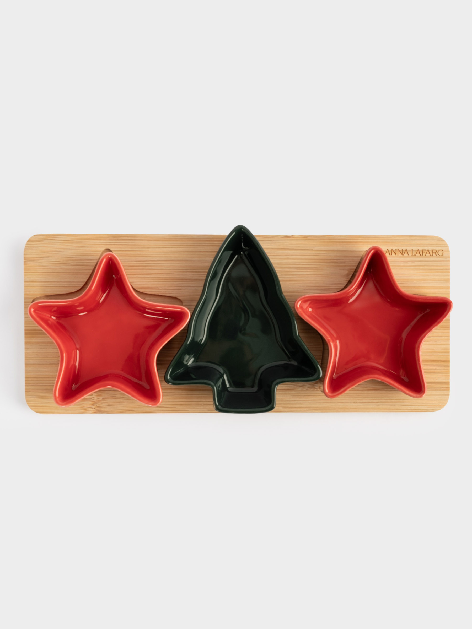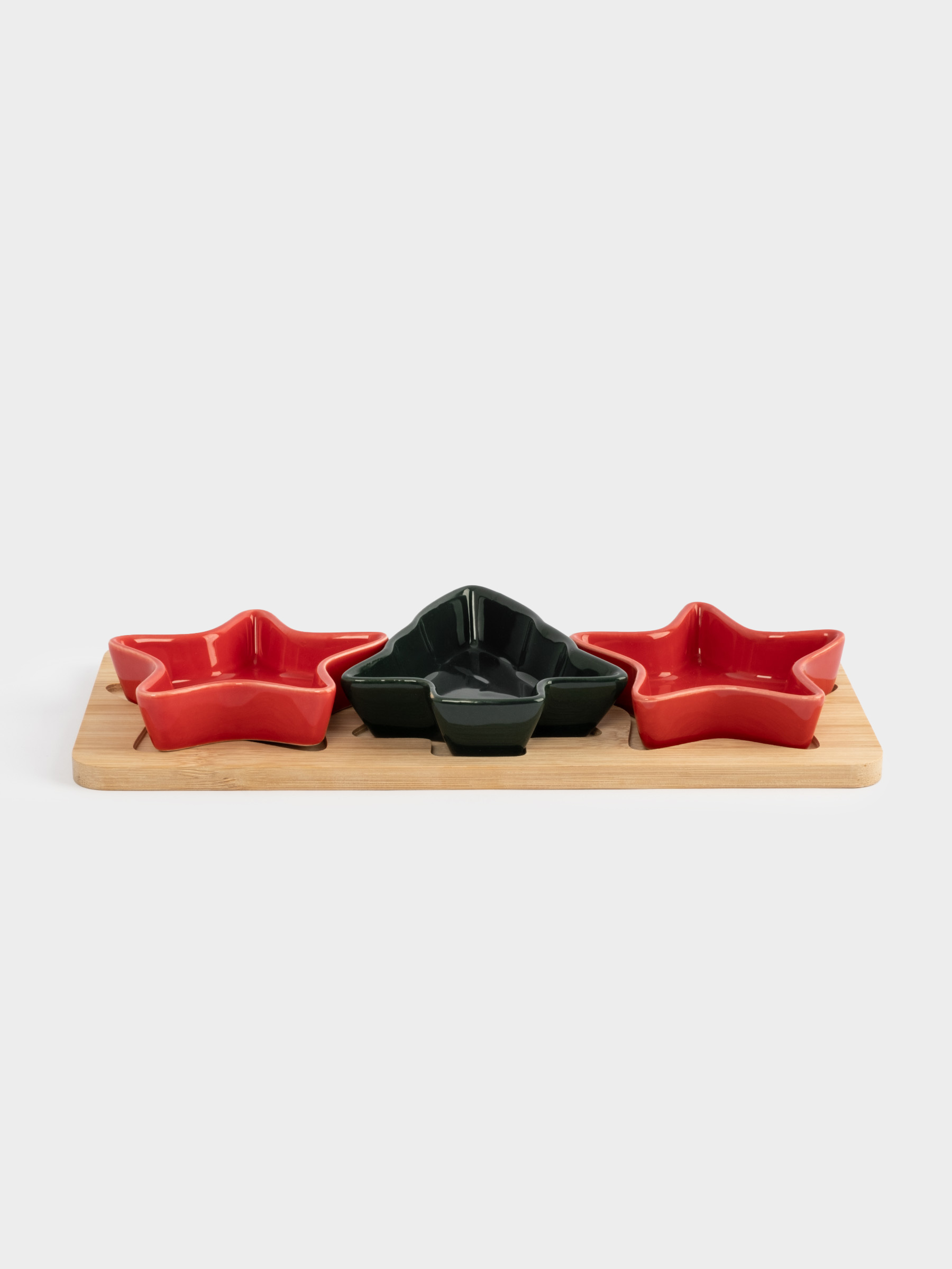 Набор для закусок, 3 предмета. Комплектация и размеры: пиала Звезда - 10,5х10,5х2,5 см - 2 штуки, пиала Елка - 12х10х2,5 см - 1 штука, подставка - 28,5х12х1 см - 1 штука. Материал: керамика, бамбук. Используется для подачи закусок, снеков и соусов. Рекомендации по уходу: мыть вручную с применением мягких моющих средств. Не использовать для ухода абразивные чистящие средства и жесткие губки. Пиалы можно мыть в посудомоечной машине
