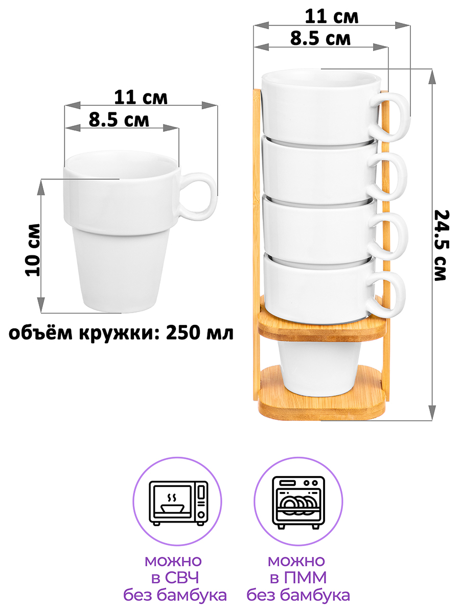 Набор кружек 4 пр. 250 мл 11*8,5*24 см "Айсберг" на бамбуковой подставке