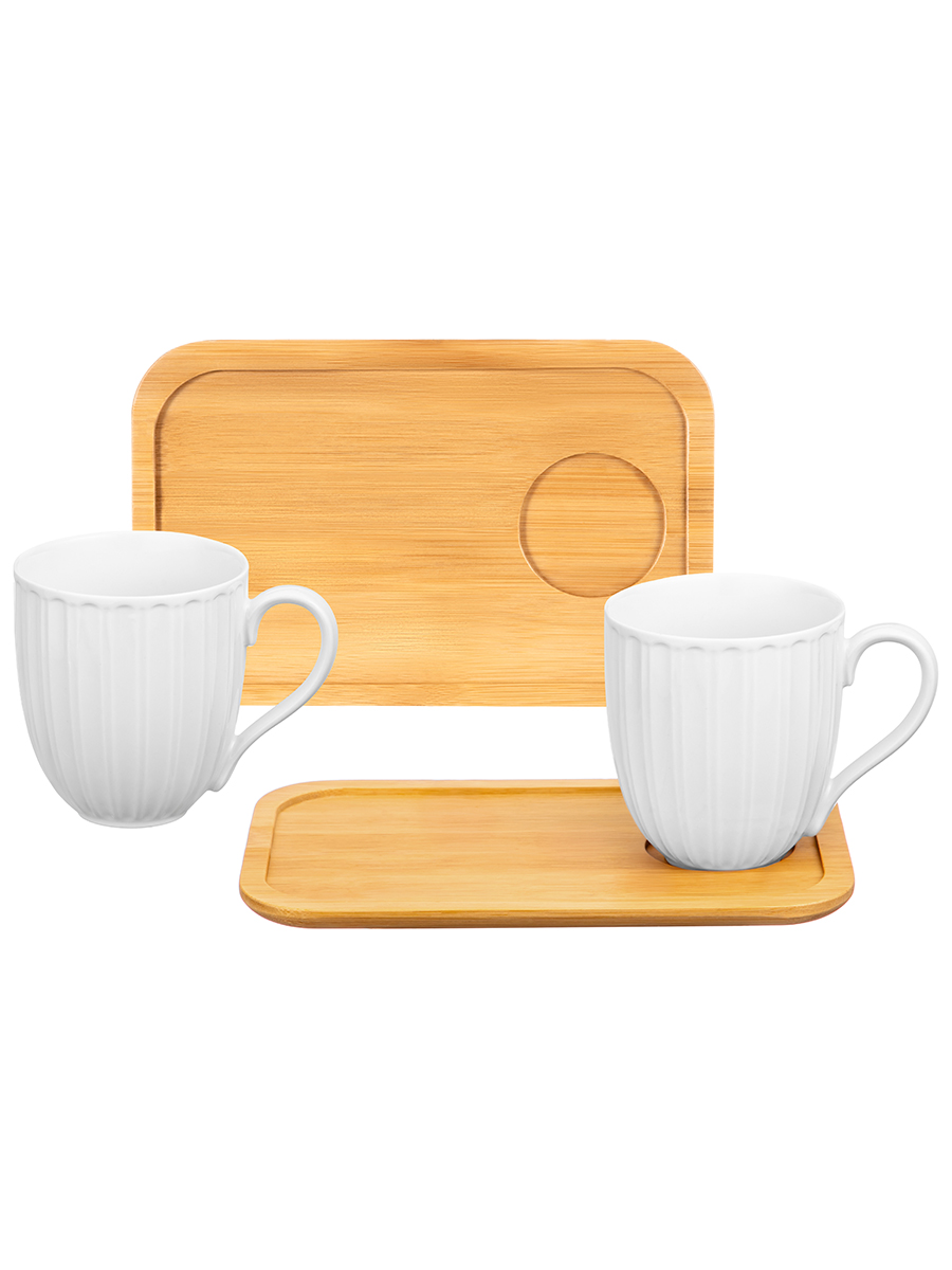 Набор 2 кружек с блюдцами для десертов из серии «Ампир» от Elan Gallery предназначен для эстетичной сервировки стола. Размер каждой ёмкости – 12х8,5х9,5 см, объём – 330 мл. Выполнены из высококачественного белого фарфора. Он не впитывает цвет напитков и легко отмывается, благодаря чему надолго сохраняет свою белизну. Поверхность изделий украшает элегантный ребристый рельеф. Блюдца выполнены из натурального бамбука. Размер каждого – 22х14х1 см. Кофейные кружки помогут вам провести множество приятных завтраков с капучино и латте, а также уютные чайные вечера с конфетами, вафлями, другими десертами и сладостями. Подойдут ценителям чая и кофе, которые любят пить из красивой и необычной посуды. Согрейтесь зимой любимым напитком: какао с маршмэллоу, ягодным чаем или горячим шоколадом. Летом освежитесь домашним лимонадом или морсом. Используйте прямоугольные деревянные блюдца как подставку для чашек благодаря круглым выемкам, и одновременно – как десертные тарелочки для пирожных, кусочков торта и других угощений. Не рекомендуется применять абразивные моющие средства. Без бамбуковых блюдец подходят для использования в посудомоечной машине и микроволновой печи. Бамбук нельзя замачивать! Поставляются в дизайнерской картонной коробке – благодаря ей вам не потребуется дополнительная подарочная упаковка. Фарфоровая сервировочная посуда будет оригинальным подарком для хозяйки, ценящей не только практичность, но и привлекательность. Серия «Ампир» от бренда Элан Галерея станет украшением любого кухонного инвентаря и позволит собрать красивый сервиз в едином стиле!