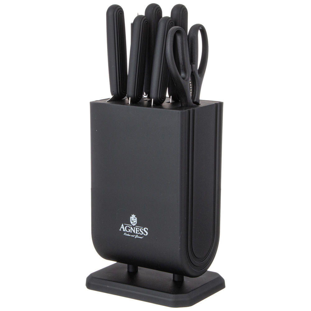 ● Состав набора: Состав набора: Нож поварской 20см, Нож для хлеба 20см, Нож для нарезки 20см, Нож универсальный 12,5см, Нож для чистки овощей и фруктов, 9см, Муссат, Ножницы, Пластиковая подставка для безопасного хранения ножей