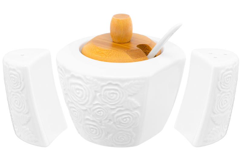 Набор серии посуды "Розы" 16х10х11 см состоит из 3-х предметов на бамбуковой подставке: сахарница 300 мл, солонка и перечница по 40 мл. Сахарницу можно использовать для подачи к столу сахара, варенья, меда, соусов, специй и других продуктов. Органайзер для соли и перца украсит каждодневный обеденный стол и эстетично дополнит интерьер на праздник, например, на Пасху. Кухонные банки выполнены из белого фарфора, который отличается от керамики повышенной плотностью. Изделия не впитывают цвет и не деформируются от влаги, чему может быть подвержена керамическая посуда. Контейнеры можно наполнить через отверстия снизу, закрытые пластиковыми пробками. Размеры емкостей 10х9х10 см, 4,5х4х6,7 см, 4,5х4х6,7 см. Фарфоровые детали подходят для СВЧ и ПММ. Бамбук нельзя замачивать. Комплект поставляется в яркой картонной упаковке. Баночки для хранения и сервировки приправ смогут стать маленьким красивым декором кухни и дома или приятным подарком для ваших родных и близких!