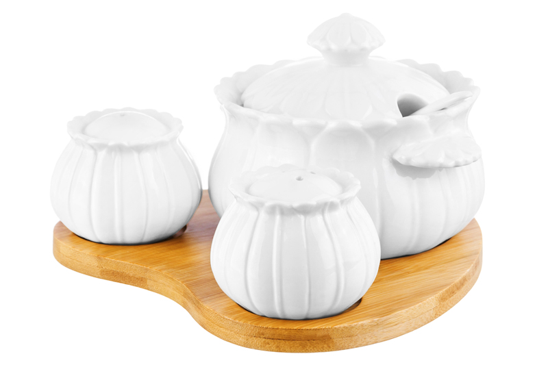 Набор - сахарница 400 мл 17,5*16*10 см "Цветок" с ложкой + солонка + перечница на дерев.подставке