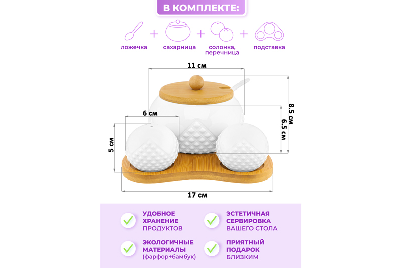 Набор серии посуды "Ромбики" 16х17х8,5 см состоит из 3-х предметов на бамбуковой подставке: сахарница 440 мл, солонка и перечница по 75 мл. Сахарницу можно использовать для подачи к столу сахара, варенья, меда, соусов, специй и других продуктов. Органайзер для соли и перца украсит каждодневный обеденный стол и эстетично дополнит интерьер на праздник, например, на Пасху. Кухонные банки выполнены из белого фарфора, который отличается от керамики повышенной плотностью. Изделия не впитывают цвет и не деформируются от влаги, чему может быть подвержена керамическая посуда. Контейнеры можно наполнить через отверстия снизу, закрытые пластиковыми пробками. Размеры емкостей 11х11х8,5 см, 6х6х5 см, 6х6х5 см. Фарфоровые детали подходят для СВЧ и ПММ. Бамбук нельзя замачивать. Комплект поставляется в яркой картонной упаковке. Баночки для хранения и сервировки приправ смогут стать маленьким красивым декором кухни и дома или приятным подарком для ваших родных и близких!