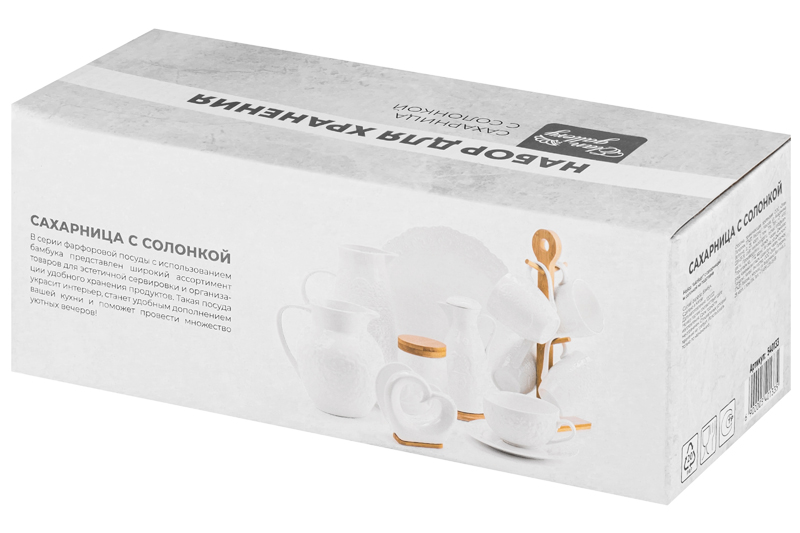 Набор сахарницы и солонки из серии «Айсберг» на бамбуковой подставке предназначен для сервировки стола и организации хранения продуктов на вашей кухне. Размер сахарницы – 11х11х11 см, объём – 550 мл; размер солонки – 8х8х8,5 см, объём – 170 мл. Общий размер изделия – 27х11,5х12 см. Банки округлой формы выполнены из высококачественного белого фарфора и украшены геометрическим рельефным узором. Подойдут для сыпучих продуктов: сахара, соли, перца, специй и приправ, кофе и чая. Набор поможет держать под рукой всё необходимое во время приготовления пищи. Ёмкости также можно наполнить разнообразными сладостями: мёдом, вареньем или джемом. Крышки со свободной посадкой предназначены для быстрого и лёгкого снятия. Они обеспечивают достаточную герметичность, чтобы сохранить целостность наполнения. Набор отлично послужит в качестве сервировочного: ручки подставки помогут вам легко подавать его к столу во время застолий или чаепитий, а круглые углубления в поддоне гарантируют устойчивость контейнеров при переноске. Благодаря лаконичному дизайну они впишутся в интерьер любого дома. Не рекомендуется применять абразивные моющие средства. Без бамбуковых элементов можно использовать в посудомоечной машине и микроволновой печи. Бамбук нельзя замачивать. Набор поставляется в красивой картонной упаковке. Интересные кухонные принадлежности станут прекрасным подарком для любой хозяйки и украшением вашего инвентаря. Создайте атмосферу уюта с декоративной фарфоровой посудой!