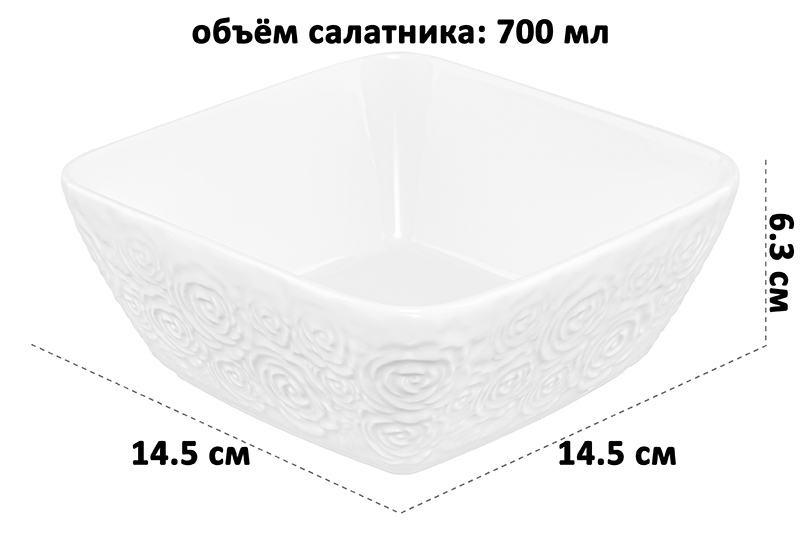 Набор салатников из серии «Розы» предназначен для подачи закусок. Размер каждого изделия – 14,5х14,5х6,3 см, объём – 700 мл. Выполнены из высококачественного белого фарфора и украшены рельефным узором в виде бутонов роз. Фарфор не впитывает цвет продуктов и надолго сохранит свою роскошную белизну. Благодаря лаконичному, но изысканному дизайну посуда впишется в любой интерьер. Подойдут не только для салатов, но и для любых других закусок и угощений. Используйте глубокие тарелки для красивой подачи овощей, фруктов и ягод. Заполните мясной и сырной нарезкой и украсьте свежей зеленью. Ёмкости отлично послужат в качестве конфетниц – сложите в них любимые сладости и печенья. Декоративные фарфоровые блюда станут незаменимым элементом сервировки как в будни, так и на праздник. Не рекомендуется применять абразивные моющие средства. Можно использовать в посудомоечной машине и микроволновой печи. Набор поставляется в красивой картонной коробке – благодаря ей вам не потребуется дополнительная подарочная упаковка. Это идеальный подарок для хозяйки, ценящей не только практичность, но и стиль. Посуда из серии «Розы» преобразит вашу кухню и позволит собрать сервиз в едином стиле!