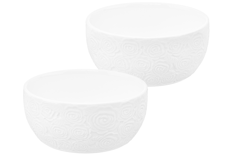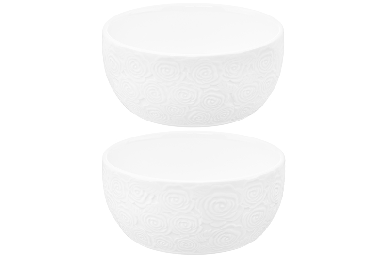 Набор из двух салатников Elan Gallery "Розы" выполнен из белого фарфора с рельефным узором. Размер каждого салатника – 14х14х6,3 см, объём – 600 мл. Используйте тарелочки для любых закусок и угощения гостей на празднике или вечеринке. Подойдут не только для салатов, можно использовать для сервировки любых сладостей, например, конфет или печенья. Положите в фарфоровую ёмкость кабачковую икру или свежие овощи, чтобы порадовать гостей. Можно использовать в микроволновой печи и мыть в посудомоечной машине. Поставляются в стильной картонной упаковке. Подарочные фарфоровые блюда порадуют ваших близких на любой праздник. Кухонный инвентарь с рельефным узором в виде цветов станет незаменимым помощником при сервировке стола и предметом декора вашего дома!