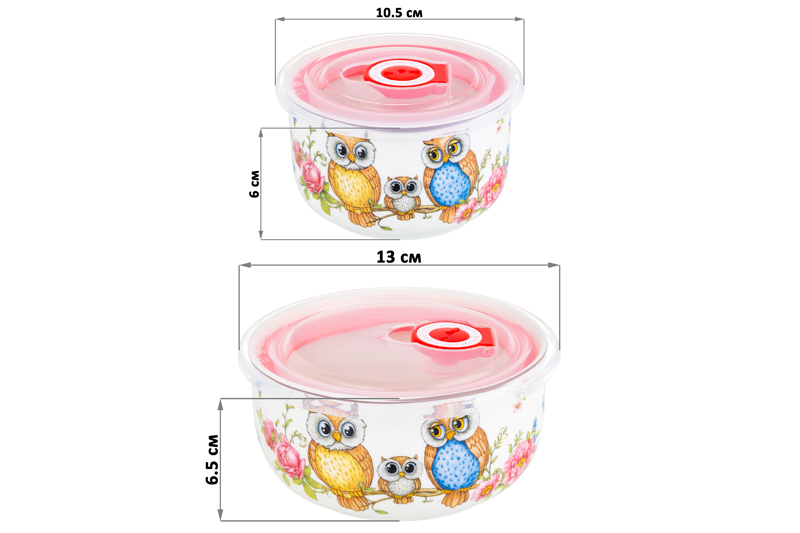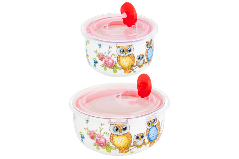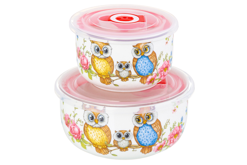 Набор 2 салатников из серии «Совушки» от Elan Gallery предназначен для эстетичной сервировки вашего стола. Включает изделия разных размеров. Размер первого изделия – 13х13х6,5 см, объём – 560 мл. Размер второго изделия – 10,5х10,5х6 см, объём – 260 мл. Выполнены из фарфора нового поколения new bone china, сочетающего в себе изящность и высокую прочность. За счёт гладкости изделия легко отмываются, поэтому сохраняют привлекательный внешний вид и практичны в использовании. Плотная структура материала позволяет посуде дольше сохранять температуру блюд и напитков. От других видов костяного фарфора new bone china отличается большей экологичностью в производстве. Поверхность изделий украшает забавный рисунок: две совы и маленький совёнок с большими глазами сидят на ветке дерева. Нежные бутоны розовых и голубых цветов, а также растительный узор на фоне придают композиции сказочности и тепла. Крышки выполнены из пищевого пластика и оснащены силиконовыми уплотнителями. Имеют календарные индикаторы – можно отслеживать, как долго пища хранится внутри. Глубокие миски станут идеальным вариантом для любителей здорового питания. Используйте их для подачи салатов, овощей и фруктов. Кроме того, они послужат для сервировки холодных закусок и гарниров, разнообразных сладостей и десертов. Задействуйте их в качестве конфетниц для организации уютного чаепития. Не рекомендуется применять абразивные моющие средства. Подходят для использования в посудомоечной машине, без крышки или с открытым клапаном подходят для микроволновой печи. Поставляются в дизайнерской картонной коробке – благодаря ей вам не потребуется дополнительная подарочная упаковка. Фарфоровая сервировочная посуда будет оригинальным подарком для хозяйки, ценящей не только практичность, но и привлекательность. Серия «Совушки» от бренда Элан Галерея станет украшением любого кухонного инвентаря и позволит собрать красивый сервиз в едином стиле!