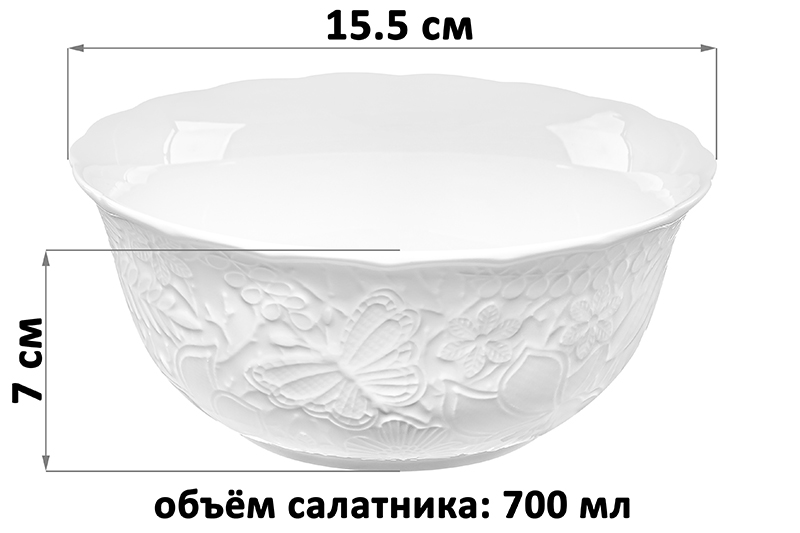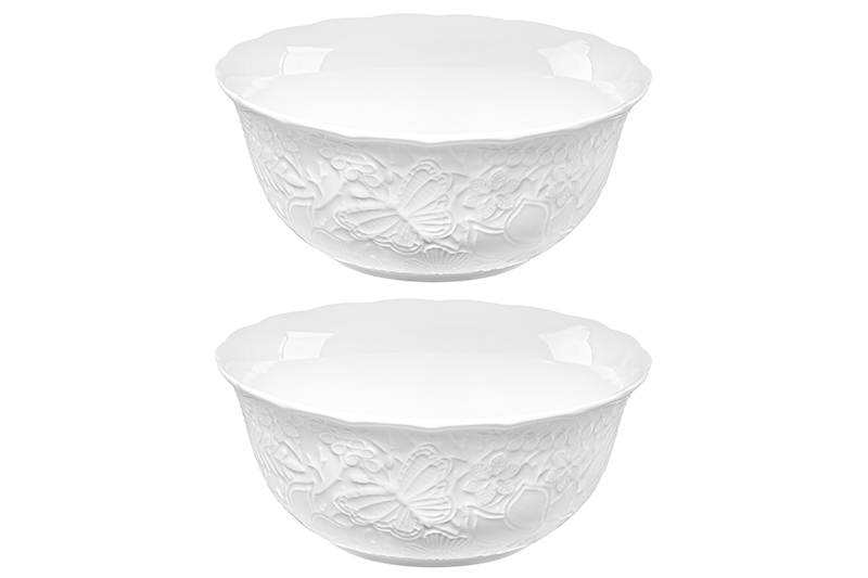 Набор 2 салатников Elan Gallery "Лесная фантазия" выполнен из белого фарфора. Размер каждого блюда – 15,5x15,5x7 см, объём – 700 мл. Имеют волнистые края. Коллекция посуды "Лесная фантазия" украшена изящным рельефным узором в виде цветов и порхающих бабочек. Она навевает фантазии о лесной поляне — благоухающей и согретой лучами солнца. Салатницы займут отличное место в вашей коллекции фарфоровой посуды. Используйте тарелку для любых закусок и угощения гостей на празднике или вечеринке. Подойдет не только для салатов, но и сервировки любых сладостей, например, конфет или печенья. Положите в фарфоровую ёмкость кабачковую икру или свежие овощи, чтобы порадовать гостей. Благодаря глубокой форме салатницу можно использовать вместо обеденных тарелок для супа или каши. Кухонный инвентарь станет универсальным помощником при сервировке стола. Не рекомендуется применять абразивные моющие средства. Беречь от резких перепадов температур и механических повреждений. Каждый салатник подходит для использования в микроволновой печи и посудомоечной машине. Комплект поставляется в стильной картонной коробке. Вам не придётся искать дополнительную подарочную упаковку, чтобы сделать сюрприз близким на праздник. Праздничная посуда – хороший вариант для подарка. В коллекции бренда Элан Галерея можно найти много красивого кухонного и столового инвентаря, а также собрать сервиз на свой вкус. Коллекция "Лесная фантазия" от Elan Gallery наполнит повседневные моменты лёгкостью и сказочной атмосферой, а также позволит создать красивую сервировку праздничного стола!