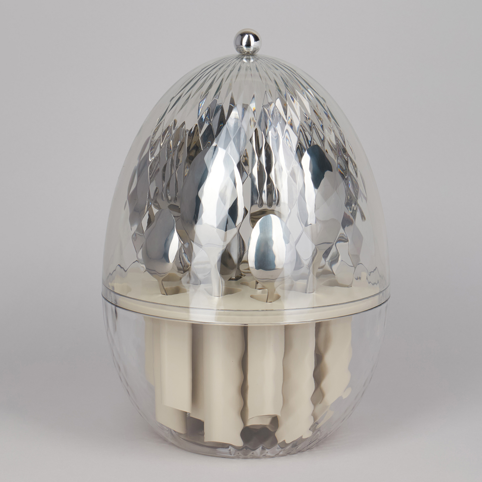 Премиальный набор столовых приборов на 6 персон. Высокое качество обеспечит длительный срок службы и надежность в эксплуатации. Безупречный внешний вид, эргономичность, удобная форма столовых приборов подойдет для торжественной сервировки. Удобная вращающаяся подставка в форме яйца позволит хранить все предметы компактно, легко и доступно. Сделайте сервировку по-настоящему выдающейся!