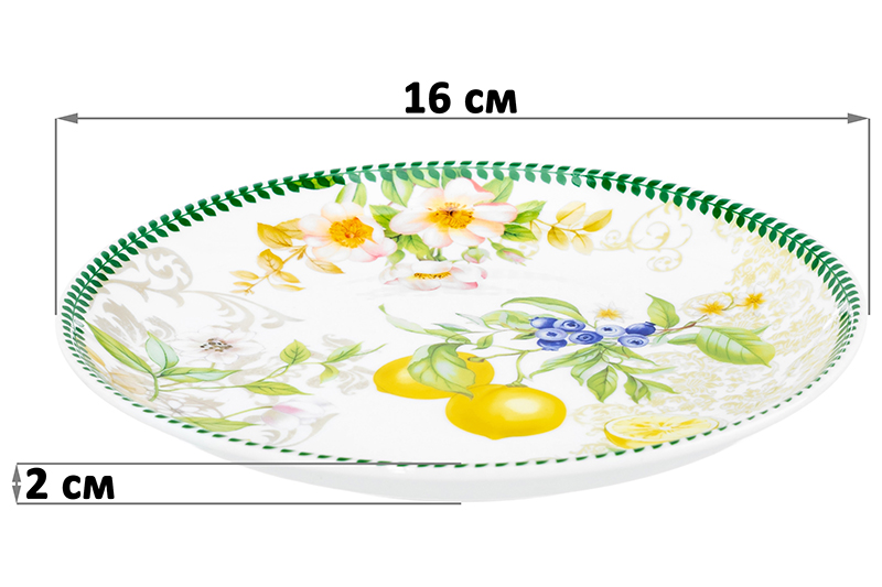 Набор 2 круглых тарелок Elan Gallery "Лимоны" выполнен из фарфора new bone china, сочетающего в себе изящность и высокую прочность. Размер каждого изделия — 16х16х2 см. За счёт гладкости изделия легко отмываются, поэтому долго сохраняют привлекательный вид и практичны в использовании. Плотная структура материала позволяет посуде дольше сохранять температуру блюд и напитков. От других видов костяного фарфора new bone china отличается большей экологичностью в производстве. Фарфоровая посуда с ярким рисунком в виде лимонов станет изящным дополнением интерьера любой кухни или столовой. Удобно использовать для десерта. Пирожковые тарелочки станут украшением интерьера кухни или гостиной. Положите на сервировочное блюдце кусочек торта, домашнего пирога или пирожное. Небольшая тарелочка подойдёт для подачи закусок: сырной нарезки, сырокопчёной колбасы или свежих овощей и зелени. Разместите на десертном блюде выпечку и сыр, чтобы перекусить за чашечкой кофе на завтрак. Фарфоровая посуда отличается от керамической повышенной плотностью. Фарфор не впитывает цвет продуктов и не деформируется от влаги, чему может быть подвержена керамика. Блюдечко легко отмывается и долго сохраняет привлекательный вид. Маленькие блюдца для сладостей восхитят ваших гостей и добавят элегантности при сервировке стола как в будни, так и на праздник. Не рекомендуется применять абразивные моющие средства. Подходят для использования в посудомоечной машине и микроволновой печи. Поставляются в красивой картонной коробке – благодаря ей вам не потребуется дополнительная подарочная упаковка. Набор станет оригинальным подарком для любой хозяйки и незаменимым элементом сервировочного инвентаря в вашем доме!