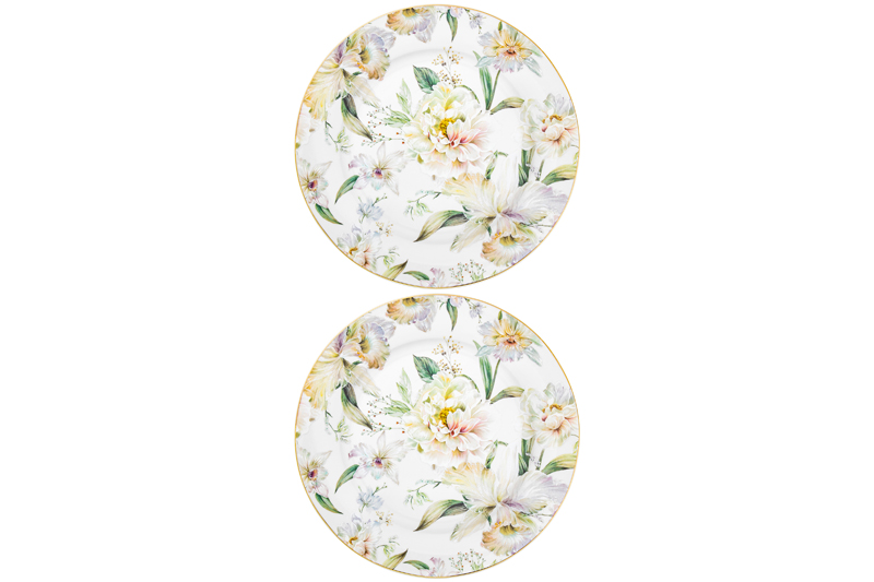 Набор 2 тарелок из серии "Корнелия" от Elan Gallery предназначен для эстетичной сервировки вашего стола. Размер каждого изделия – 26,5х26,5х2 см. Посуда выполнена из фарфора нового поколения new bone china, сочетающего в себе изящность и высокую прочность. За счёт гладкости изделия легко отмываются, поэтому сохраняют привлекательный внешний вид и практичны в использовании. Плотная структура материала позволяет посуде дольше сохранять температуру блюд. От костяного фарфора new bone china отличается большей экологичностью в производстве. Поверхность изделия овивают обворожительные белые пионы. Они выполнены в манере, вдохновлённой акварельным рисунком. Тонкая золотистая окантовка служит деликатным акцентом и подчёркивает их изысканность. Сервировочный набор отлично подойдёт для подачи вторых блюд, закусок и салатов. Заполните их пастой и деликатесами из рыбы, красиво выложите нарезку из свежих овощей и фруктов, сыров и яиц. Положите роллы и суши для вкусного перекуса. Блюда помогут преподнести разнообразные десерты, сладости и выпечку. Разложите конфеты, разместите по кусочку торта на дружеском или семейном чаепитии. Элегантные тарелочки украсят интерьер кухни или столовой. Не рекомендуется применять абразивные моющие средства. Нельзя использовать в посудомоечной машине и микроволновой печи. Поставляются в дизайнерской картонной коробке – благодаря ей вам не потребуется дополнительная подарочная упаковка. Фарфоровая сервировочная посуда станет оригинальным подарком на любой праздник для тех, кто ценит сочетание практичности и привлекательности. Серия "Корнелия" от бренда Элан Галерея добавит вашему кухонному инвентарю лёгкости и элегантности, преобразив любую сервировку!