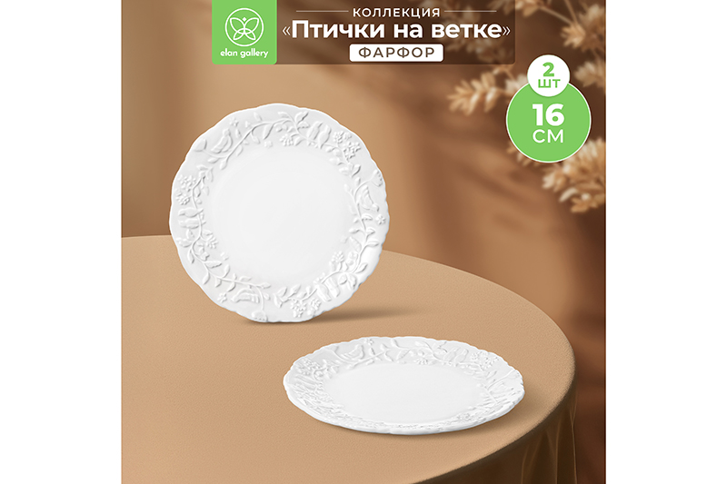 Набор 2 круглых тарелок с ажурными краями Elan Gallery "Птички на ветке" выполнен из белого фарфора. Размер каждого изделия — 16х16х1,7 см. Фарфоровая посуда с рельефными узорами станет изящным дополнением интерьера любой кухни или столовой. Удобно использовать для десерта. Закусочные тарелочки станут украшением интерьера кухни или гостиной. Положите на сервировочное блюдце кусочек торта, домашнего пирога или пирожное. Небольшая тарелочка подойдёт для подачи закусок: сырной нарезки, сырокопчёной колбасы или свежих овощей и зелени. Разместите на десертном блюде выпечку и сыр, чтобы перекусить за чашечкой кофе на завтрак. Фарфоровая посуда отличается от керамической повышенной плотностью. Фарфор не впитывает цвет продуктов и не деформируется от влаги, чему может быть подвержена керамика. Блюдечко легко отмывается и долго сохраняет привлекательный вид. Маленькие блюдца для сладостей восхитят ваших гостей и добавят элегантности при сервировке стола как в будни, так и на праздник. Не рекомендуется применять абразивные моющие средства. Подходят для использования в посудомоечной машине и микроволновой печи. Поставляются в красивой картонной коробке – благодаря ей вам не потребуется дополнительная подарочная упаковка. Набор станет оригинальным подарком для любой хозяйки и незаменимым элементом сервировочного инвентаря в вашем доме!