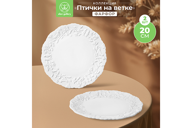 Набор 2 круглых тарелок с ажурными краями "Птички на ветке" от Elan Gallery выполнен из фарфора. Размер каждого изделия — 20,5х20,5х1,8 см. Тарелочки в классическом стиле подойдут к любому интерьеру кухни или гостиной. Можно использовать как десертные или для вторых блюд. Положите на сервировочное блюдце кусочек торта, домашнего пирога или пирожное. Небольшая тарелочка подойдёт для подачи закусок: сырной нарезки, сырокопчёной колбасы или свежих овощей и зелени. Разместите на блюде выпечку и сыр, чтобы перекусить за чашечкой кофе на завтрак. Фарфоровая посуда отличается от керамической повышенной плотностью. Фарфор не впитывает цвет продуктов и не деформируется от влаги, чему может быть подвержена керамика. Блюдечко легко отмывается и долго сохраняет привлекательный вид. Не рекомендуется применять абразивные моющие средства. Можно использовать в микроволновой печи и мыть в посудомоечной машине. Комплект поставляется в стильной картонной коробке. Станет прекрасным подарком на любой праздник. Благодаря стильной коробочке не понадобится дополнительная подарочная упаковка! Красивые блюдца восхитят ваших гостей и добавят элегантности при сервировке стола как в будни, так и на праздник. Серия "Птички на ветке" позволит собрать целый столовый сервиз! В коллекции бренда Elan Gallery можно найти много красивых товаров для дома, например, кухонный инвентарь и декоративные изделия на любой вкус.