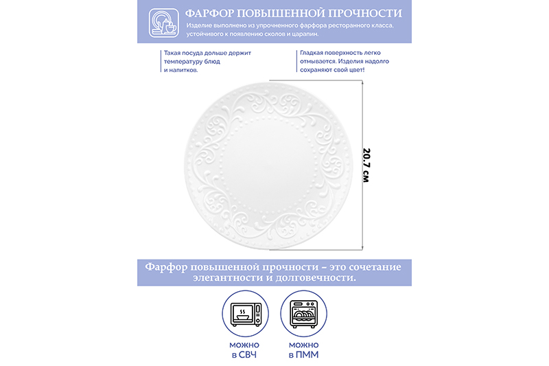 Набор 2 тарелок из серии «Ажур» от Elan Gallery предназначен для эстетичной сервировки вашего стола. Размер каждого изделия – 20,7х20,7х2 см. Выполнены из фарфора нового поколения new bone china, сочетающего в себе изящность и высокую прочность. Такие изделия легко отмываются, поэтому сохраняют привлекательный вид и практичны в использовании. Плотная структура материала позволяет посуде дольше сохранять температуру блюд и напитков. От других видов костяного фарфора new bone china отличается большей экологичностью в производстве. Поверхность изделий украшают вьющиеся и точечные рельефные узоры. Сервировочный набор отлично подойдёт для подачи вторых блюд, закусок и салатов. Заполните их пастой и деликатесами из рыбы, красиво выложите нарезку из свежих овощей и фруктов, сыров и яиц. Положите роллы и суши для вкусного перекуса. Блюда помогут преподнести разнообразные десерты, сладости и выпечку. Разложите конфеты, разместите по кусочку торта на дружеском или семейном чаепитии. Элегантные тарелочки впишутся в интерьер любой кухни или столовой. Не рекомендуется применять абразивные моющие средства. Подходят для использования в посудомоечной машине и микроволновой печи. Поставляются в дизайнерской картонной коробке – благодаря ей вам не потребуется дополнительная подарочная упаковка. Фарфоровая сервировочная посуда будет оригинальным подарком для хозяйки, ценящей не только практичность, но и привлекательность. Серия «Ажур» от бренда Элан Галерея станет украшением любого кухонного инвентаря и позволит собрать красивый сервиз в едином стиле!