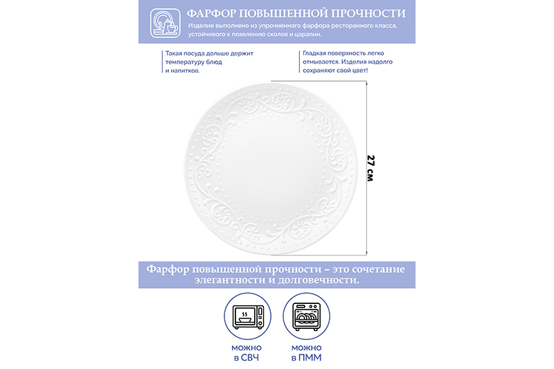 Набор 2 тарелок из серии «Ажур» от Elan Gallery предназначен для эстетичной сервировки вашего стола. Размер каждого изделия – 27х27х2 см. Выполнены из фарфора нового поколения new bone china, сочетающего в себе изящность и высокую прочность. Такие изделия легко отмываются, поэтому сохраняют привлекательный вид и практичны в использовании. Плотная структура материала позволяет посуде дольше сохранять температуру блюд и напитков. От других видов костяного фарфора new bone china отличается большей экологичностью в производстве. Поверхность изделий украшают вьющиеся и точечные рельефные узоры. Сервировочный набор отлично подойдёт для подачи вторых блюд, закусок и салатов. Заполните их пастой и деликатесами из рыбы, красиво выложите нарезку из свежих овощей и фруктов, сыров и яиц. Положите роллы и суши для вкусного перекуса. Блюда помогут преподнести разнообразные десерты, сладости и выпечку. Разложите конфеты, разместите по кусочку торта на дружеском или семейном чаепитии. Элегантные тарелочки впишутся в интерьер любой кухни или столовой. Не рекомендуется применять абразивные моющие средства. Подходят для использования в посудомоечной машине и микроволновой печи. Поставляются в дизайнерской картонной коробке – благодаря ей вам не потребуется дополнительная подарочная упаковка. Фарфоровая сервировочная посуда будет оригинальным подарком для хозяйки, ценящей не только практичность, но и привлекательность. Серия «Ажур» от бренда Элан Галерея станет украшением любого кухонного инвентаря и позволит собрать красивый сервиз в едином стиле!