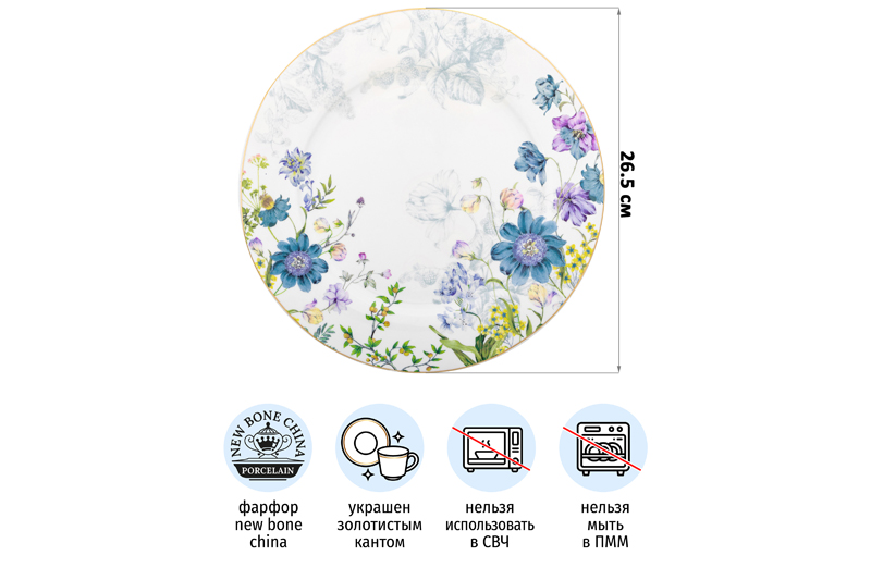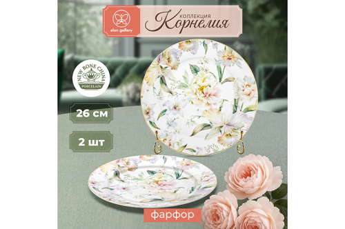 Набор из двух круглых тарелок Elan Gallery "Juliette" станет украшением вашей кухни. "Juliette" — это коллекция посуды из высококачественного фарфора new bone china с изящным цветочным рисунком и золотым окаймлением. Серия вдохновлена атмосферой очарования французской провинции и переносит нас в загадочный сад. Размер каждой тарелки – 26,5х26,5х2 см. Большие тарелки для подачи на стол ваших любимых блюд станут незаменимой вещью в любом доме. Комплект подойдёт для любых закусок, например, фруктов или нарезки. Каждая тарелка станет незаменимым помощником при сервировке завтрака, ужина или вторых блюд на обед. Эргономичная форма позволит разместить на них любую еду, от блинов до пасты. Фарфоровая посуда отличается от керамики повышенной плотностью. Фарфор не впитывает цвет продуктов и не деформируется от влаги, чему может быть подвержена керамическая посуда. Универсальный набор подойдёт для сервировки стола не только в будни, но и на праздник. Не рекомендуется применять абразивные моющие средства. Из-за золотого окаймления не подходит для использования в микроволновой печи и посудомоечной машине. Поставляется в подарочной картонной упаковке. Станет отличным подарком для любой хозяйки, которая ценит стильную сервировку. Серия "Juliette" пробуждает романтическое воображение и поможет создать неповторимую атмосферу на любой кухне!