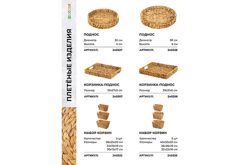 Поднос плетеный 34*34*5 см с ручками, водный гиацинт