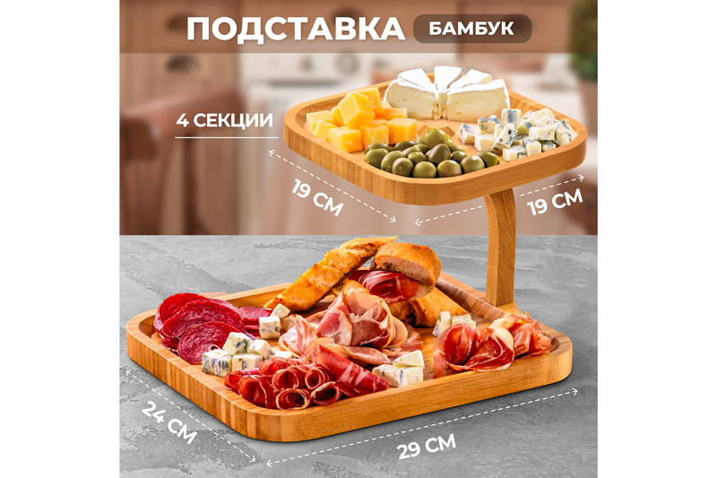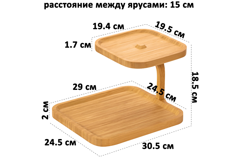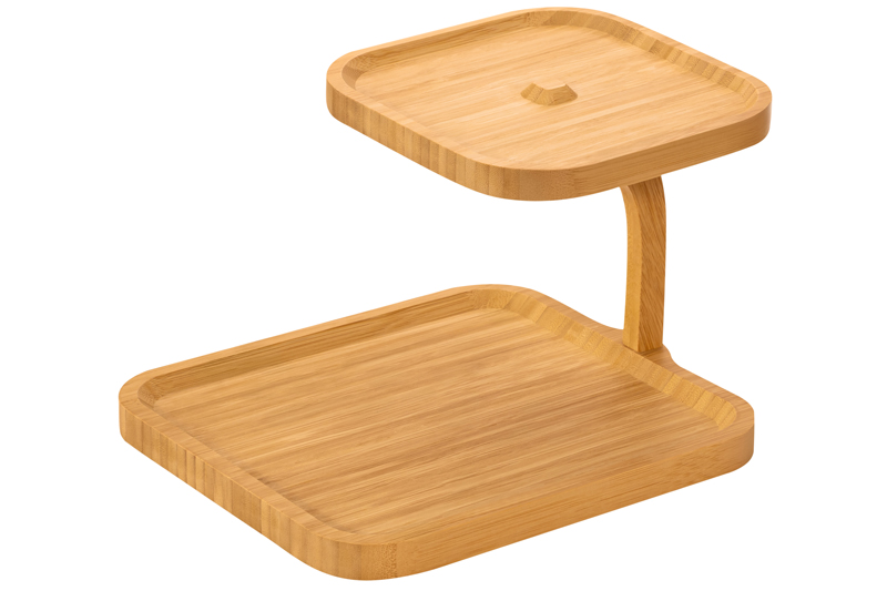 Двухъярусная подставка от Elan Gallery предназначена для эстетичной подачи еды к столу. Выполнена из натурального бамбука. Общий размер изделия – 30,5х24,5х18,5 см. Используйте её в роли полноценной посуды – она поможет подать самые разнообразные угощения. Расстояние между ярусами – 15 см. Размер нижнего яруса – 29х24,5х2 см. На блюде с бортиками можно разместить тарталетки, нарезку из сыра и мяса, а также выпечку. Подойдёт для фруктов и ягод – выложите на неё виноград или клубнику. Отделение также позволит держать под рукой бумажные салфетки или чайные пакетики. Размер верхнего яруса – 19,5х19,5х1,7 см. Используйте в качестве конфетницы: разложите любимые конфеты, зефир, мармелад и другие сладости. Заполните орехами, сухофруктами, оливками или маслинами. Натуральный цвет дерева и мягкая квадратная форма гармонично впишут многоярусную настольную этажерку в интерьер любой столовой. Прочные крепления из металла обеспечивают устойчивость и надёжность изделия. Органайзер станет функциональным и декоративным элементом семейных и дружеских застолий. Это не только полезный сервировочный аксессуар, но и элемент декора для вашего дома. Такой поднос – незаменимая принадлежность для вашей кухни. Не рекомендуется применять абразивные моющие средства. Не подходит для замачивания, использования в посудомоечной машине и микроволновой печи. После мытья тщательно протрите поверхность сухой тканью. Храните вдали от нагревательных приборов при нормальном уровне влажности. Универсальный инвентарь станет оригинальным подарком для каждого, кто ценит не только практичность, но и привлекательность. В коллекции бренда Элан Галерея вы найдёте разнообразную столовую утварь, которая поможет сделать сервировку удобной и стильной.
