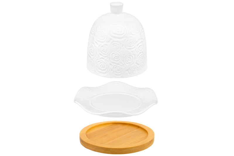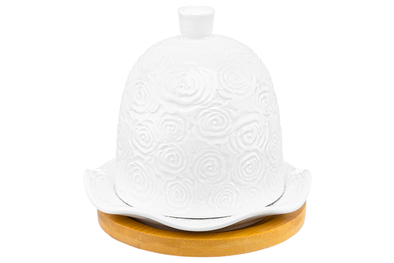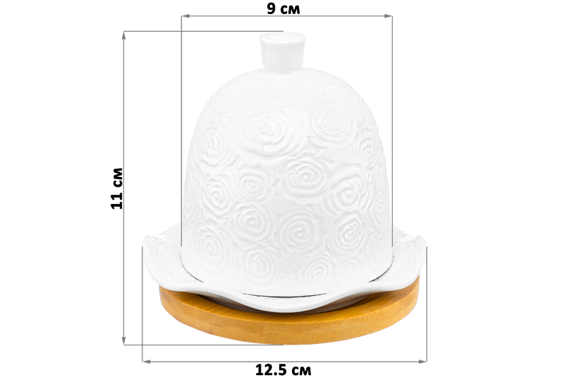 Подставка под лимон из серии «Розы» от Elan Gallery предназначена для эстетичной сервировки вашего стола. Размер изделия – 12,5х12,5х11 см, диаметр крышки – 9 см. Представляет собой фигурное блюдце с ажурными краями и крышку-купол с удобной ручкой. Выполнена из высококачественного белого фарфора. Он не впитывает цвет продуктов и легко отмывается, благодаря чему надолго сохраняет свою белизну. Поверхность изделия украшают рельефные узоры в виде пышных бутонов роз. Подставка выполнена из натурального бамбука. Элегантная лимонница украсит любой стол как в будни, так и в праздники. Подходит для хранения продуктов в холодильнике – благодаря своей форме она вмещает даже крупный лимон. Заполните сервировочное блюдце любимыми конфетами, безе, зефиром или мармеладом. Необычная крышка придаст эффектность любой подаче. Такое изделие стильно дополнит сытный завтрак и уютное чаепитие. Не рекомендуется применять абразивные моющие средства. Без бамбуковой подставки подходит для использования в посудомоечной машине и микроволновой печи. Бамбук нельзя замачивать! Поставляется в дизайнерской картонной упаковке – благодаря ей вам не потребуется дополнительная подарочная упаковка. Фарфоровая сервировочная посуда будет оригинальным подарком для хозяйки, ценящей не только практичность, но и привлекательность. Серия «Розы» от бренда Элан Галерея станет украшением любого кухонного инвентаря и позволит собрать красивый сервиз в едином стиле!