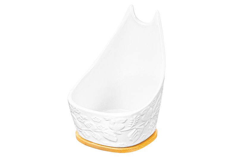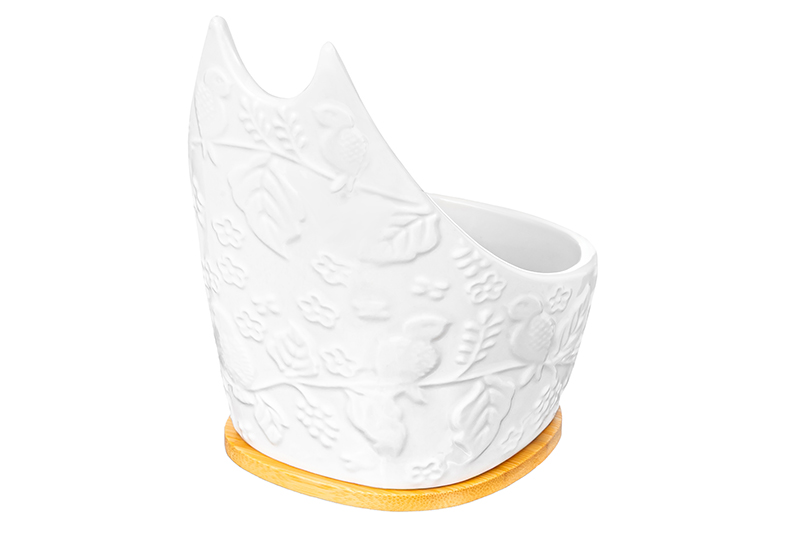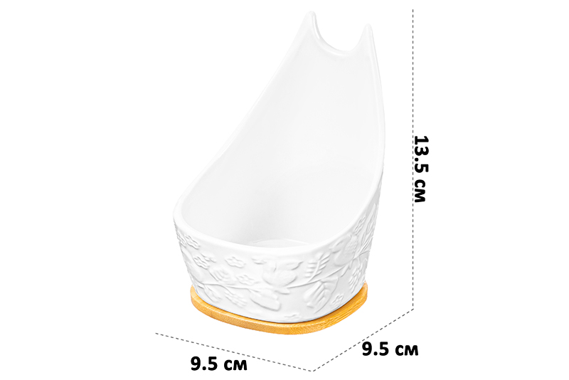 Подставка под ложку Elan Gallery "Птички на ветке" размером 9,5х9,5х13,5 см выполнена из фарфора, украшена рельефным узором. Глубина фарфоровой ёмкости 180 мл. Имеет несъёмное бамбуковое основание размером 8х8х0,5 см. Фарфоровая ложка и подставка из бамбука – одно целое. В процессе готовки вы можете положить на неё любые столовые приборы: ложки, вилки и лопатки, чтобы не испачкать поверхность. Изделия из фарфора не впитывают цвет и не деформируются от влаги, чему может быть подвержена керамика. Настольная подставка поможет сохранить стол в чистоте во время приготовления пищи. Не рекомендуется применять абразивные моющие средства. Из-за бамбуковой части эту модель нельзя использовать в посудомоечной машине и микроволновой печи. Бамбук нельзя замачивать! Посуда поставляется в стильной картонной упаковке. Полезный кухонный инвентарь станет чудесным подарком на любой праздник. Удобное приспособление для столовых приборов станет незаменимым помощником в процессе приготовления пищи и украсит интерьер вашей кухни. В ассортименте бренда Элан Галерея представлено много красивой посуды, кухонных принадлежностей и стильных товаров для дома. Выберите варианты на свой вкус!