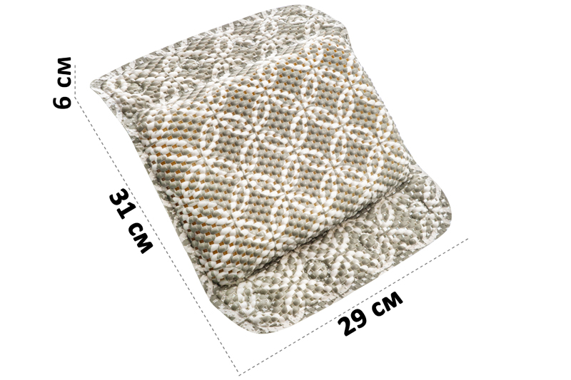 Подушка для ванны от бренда ELCASA позволит создать уголок релаксации в вашей ванной комнате! Размер изделия 31х29х6 см. Имеет приятную на ощупь поверхность и крепление в виде 8 присосок. Украшена серо-белым орнаментом. Присоски позволяют зафиксировать подголовник на ванной или джакузи. Благодаря наполнению из губки придаёт комфорта и снимает напряжение с шеи и головы. Таким образом происходит ортопедический эффект. За счёт универсального дизайна подойдёт к любому интерьеру и обеспечит условия для полноценного отдыха. Подушечка для ванны поможет создать уют во время водных процедур и расслабиться после тяжелого дня как взрослым, так и детям. Ощутите эффект спа, не покидая собственной ванной комнаты! Материал в составе изделия легко отмывается и не впитывает запахи, поэтому обладает антибактериальным эффектом. После использования тщательно промойте от остатков шампуня, пены для ванны и других гигиенических средств. Не рекомендуется применять абразивные моющие средства. Станет полезным подарком для женщин и мужчин на любой праздник. Подушечка для расслабления и снятия стресса пригодится каждому! В ассортименте бренда ELCASA представлено много стильных товаров для дома, в том числе различные аксессуары для создания вашего комфорта. Отдохните от городской суеты и расслабьтесь, как в spa-салоне, прямо у себя дома!