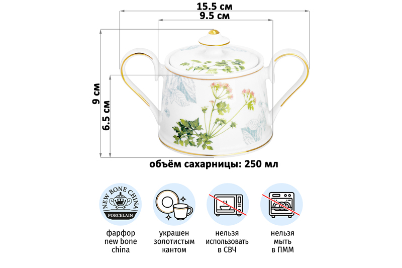 Сахарница Elan Gallery "Juliette" размером 15,5х9,5х9 см и объёмом 250 мл станет украшением вашей кухни. "Juliette" — это коллекция посуды из высококачественного фарфора new bone china с изящным цветочным рисунком и золотым окаймлением. Серия вдохновлена атмосферой очарования французской провинции и переносит нас в загадочный сад. Ёмкость подойдёт для хранения сахара, а также других продуктов, таких как варенье, мёд и даже икра. Фарфоровая баночка станет отличным элементом декора вашей кухни. Можно использовать для хранения специй и приправ, чтобы во время приготовления пищи все было под рукой. Не рекомендуется применять абразивные моющие средства. Из-за золотого окаймления не подходит для использования в микроволновой печи и посудомоечной машине. Поставляется в подарочной картонной упаковке. Красивая фарфоровая баночка порадует ваших близких на любой праздник. Серия "Juliette" пробуждает романтическое воображение и поможет создать неповторимую атмосферу на любой кухне!