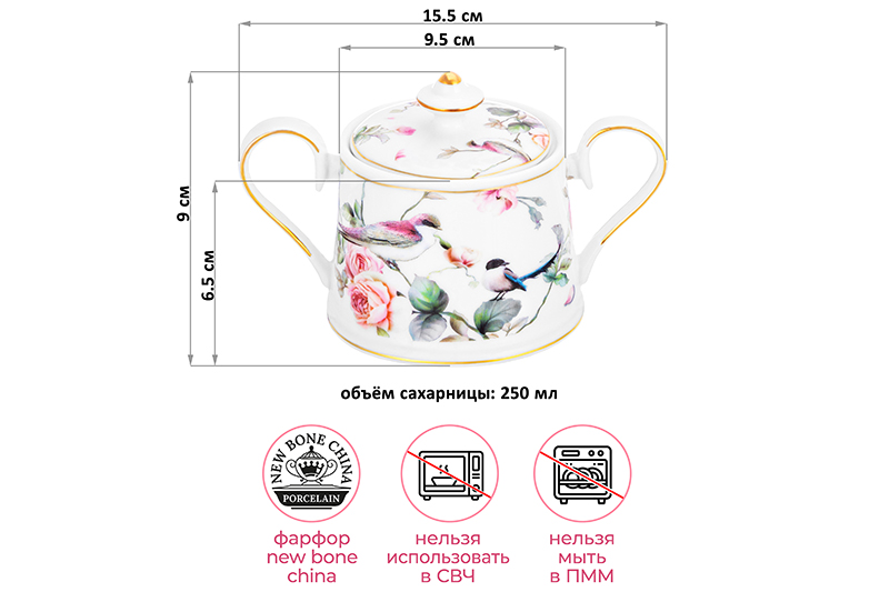 Сахарница 250 мл 15,5*9,5*9 см "Певчие птички" NEW BONE CHINA