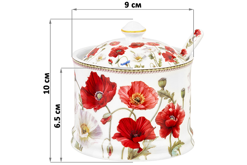 Сахарница Elan Gallery "Маки" с ложкой выполнена из фарфора нового поколения new bone china. New bone china сочетает в себе изящность и высокую прочность. От других видов костяного фарфора материал отличается большей экологичностью в производстве. Размер сахарницы – 9х9х10 см, объём – 250 мл. Серия "Маки" украшена красочным принтом с крупными цветами. Изображение красных и белых маков на фарфоре добавит ярких красок вашей кухне. Декоративная баночка с ложечкой станет гармоничным дополнением при сервировке вашего стола как в будни, так и на праздник. Она добавит особого шарма вашей кухне во время завтрака или чаепития. Стильная и функциональная сахарница займет отличное место в вашей коллекции фарфоровой посуды. Вместимость контейнера обеспечит достаточно места для хранения сахара, соли и других сыпучих продуктов на кухне или в столовой. Фарфоровая сахарница с ложечкой станет отличным элементом декора вашей кухни. Ёмкость с крышечкой можно приспособить не только под сахар, но и для варенья, мёда или икры. Отличная альтернатива медовому горшочку или бочонку, используйте её как медовницу! Подойдёт для специй или приправ. Не рекомендуется применять абразивные моющие средства. Можно использовать в микроволновой печи и мыть в посудомоечной машине. Поставляется в картонной коробке. Благодаря яркой коробочке вам не понадобится дополнительная подарочная упаковка! Станет приятным подарком для любой хозяйки, которая ценит стильную сервировку. В коллекции бренда Elan Gallery можно найти много красивого кухонного и столового инвентаря, а также собрать сервиз на свой вкус.
