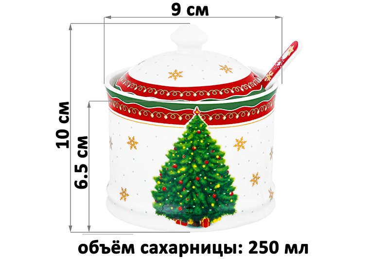 Сахарница 250 мл 9*9*10 см "Новогодняя елка" красный узор + ложка NEW BONE CHINA