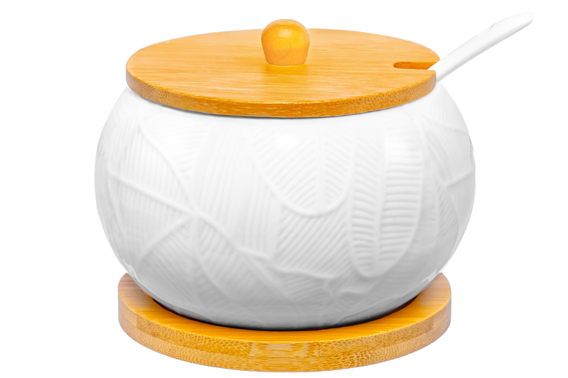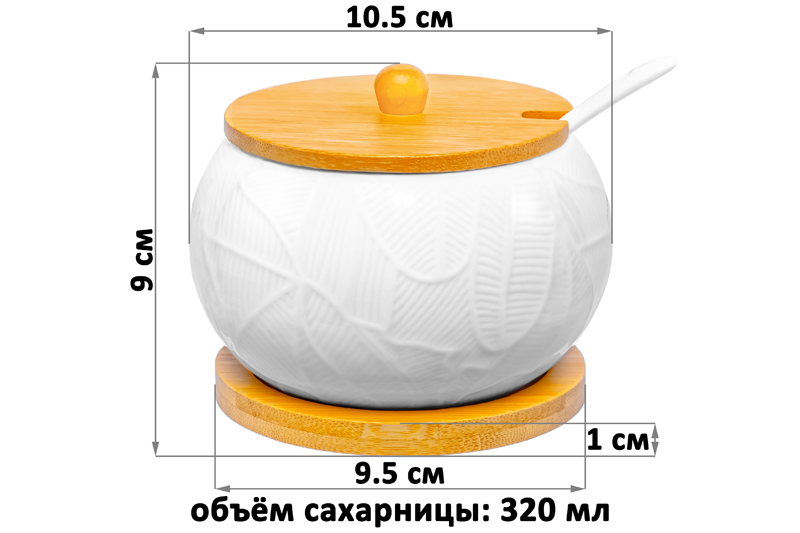 Сахарница с ложкой из серии «Танзания» от Elan Gallery предназначена для красивой сервировки вашего стола. Размер изделия – 10,5х10,5х9 см, объём – 320 мл. Выполнена из высококачественного белого фарфора. Он не впитывает цвет продуктов и легко отмывается, благодаря чему надолго сохранит свою белизну. Поверхность изделия украшает рельеф налегающих друг на друга тропических листьев с тонкими прожилками. Крышка и подставка выполнены из натурального бамбука. Декоративная баночка гармонично дополнит сервировку любого стола и добавит особого шарма вашему кухонному инвентарю. Вместительный контейнер подойдёт для хранения сахара и соли, специй, приправ и других сыпучих продуктов. Эстетичную ёмкость с крышечкой можно приспособить не только под сахар, но и под варенье, мёд или икру. Вы с лёгкостью наберёте необходимое количество с помощью ложечки, которая компактно помещается в баночку благодаря выемке на крышке. Отлично послужит в качестве медовницы и станет изящной альтернативой традиционным медовым горшочкам и бочонкам! Не рекомендуется применять абразивные моющие средства. Без бамбуковых элементов подходит для использования в посудомоечной машине и микроволновой печи. Бамбук нельзя замачивать! Поставляется в дизайнерской картонной коробке – благодаря ей вам не потребуется дополнительная подарочная упаковка. Фарфоровая сервировочная посуда послужит оригинальным подарком для хозяйки, ценящей не только практичность, но и привлекательность. Серия «Танзания» от бренда Элан Галерея станет украшением любого кухонного инвентаря и позволит собрать сервиз в едином стиле!
