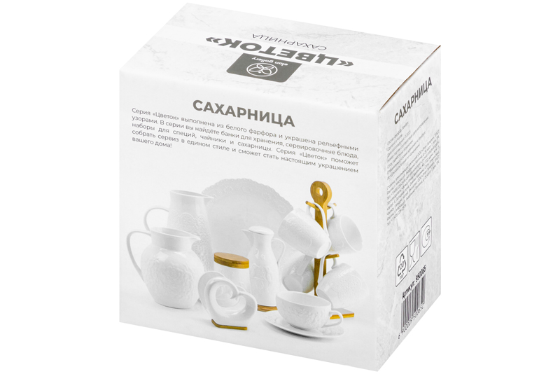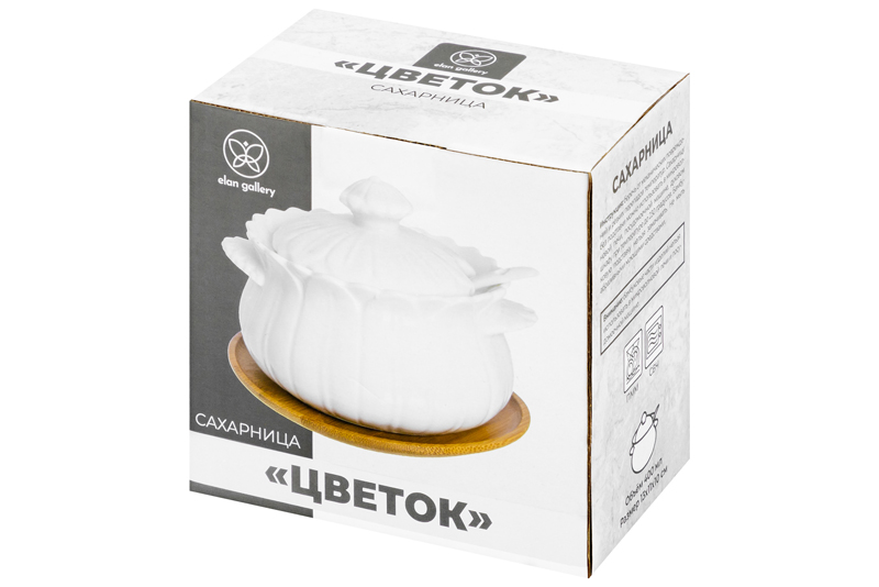 Сахарница Elan Gallery "Цветок" объёмом 400 мл с ложкой выполнена из белого фарфора с рельефным узором, напоминающим лепестки. Размер изделия – 13х11х10 см. Крышечка имеет удобную ручку оригинальной формы. Круглая подставка под сахарницу выполнена из натурального бамбука. Ёмкость подойдёт для хранения сахара, а также других продуктов, таких как варенье, мёд и даже икра. Фарфоровая баночка с ложечкой станет отличным элементом декора вашей кухни! Можно использовать для хранения специй и приправ, чтобы во время приготовления пищи все было под рукой. Без бамбуковых деталей можно использовать в посудомоечной машине. Изделия из бамбука нельзя замачивать! Поставляется в стильной картонной упаковке. Подарочная фарфоровая баночка порадует ваших близких на любой праздник. Красивый кухонный инвентарь из качественного фарфора станет незаменимым помощником при сервировке стола и предметом декора вашей кухни!