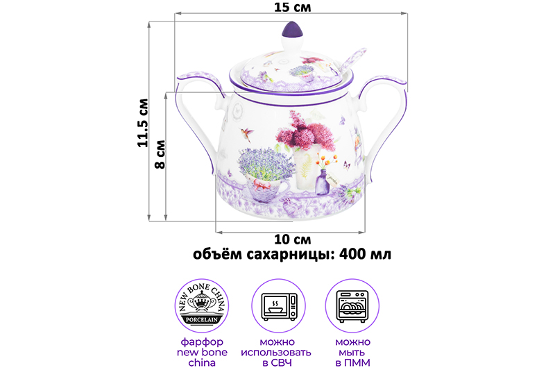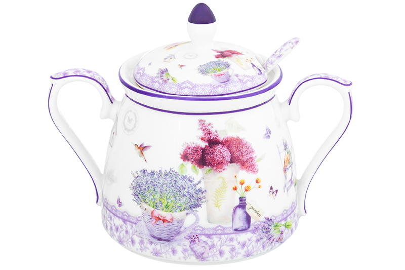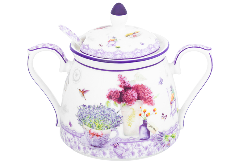 Сахарница 400 мл 15*10*11,5 см "Лаванда" с ложкой NEW BONE CHINA