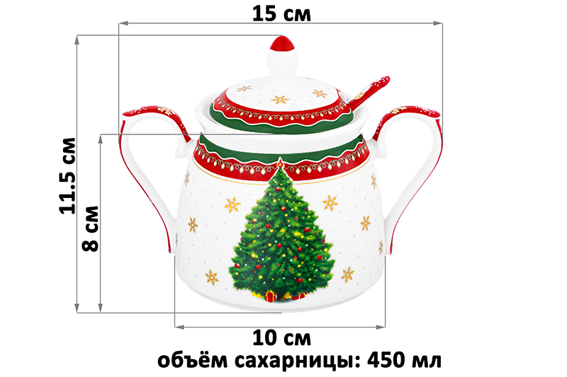 Сахарница 400 мл 15*10*11,5 см "Новогодняя елка" красный узор + ложка, NEW BONE CHINA