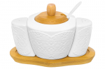 Сахарница из серии «Айсберг» объемом 500 мл с деревянной крышкой, фарфоровой ложкой и деревянной подставкой выполнена из высококачественного фарфора и натурального бамбука. Теплое цветовое решение, изящный рельефный рисунок на фарфоре и удобство использования делают эту сахарницу желанным подарком любой хозяйке. У сахарницы широкое горло, которое удобно мыть, а бамбуковая крышка не позволит сахару намокнуть. В серии фарфоровой посуды с использованием бамбука представлен широкий ассортимент товаров для сервировки стола, которые, несомненно, впишутся в любой интерьер благодаря лаконичному дизайну, натуральным материалам и высокой функциональности. Такому подарку будет рада любая хозяйка!