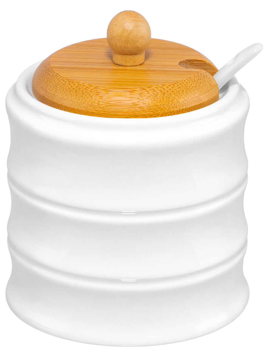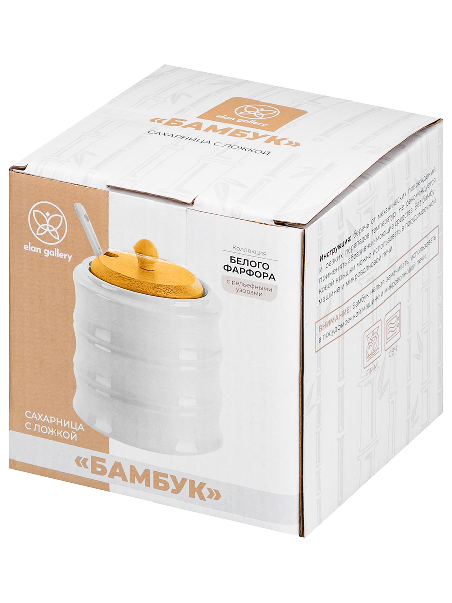 Сахарница из серии «Бамбук» от Elan Gallery предназначена для эстетичной сервировки вашего стола. Размер ёмкости – 10,5х10,5х12 см, объём – 600 мл. Выполнена из высококачественного белого фарфора. Он не впитывает цвет продуктов и легко отмывается, благодаря чему надолго сохраняет свою белизну. Поверхность изделия украшает рельеф, имитирующий бамбуковые стебли. Крышка выполнена из натурального бамбука. Поставляется в комплекте с фарфоровой ложкой размером 13х2,5 см. Декоративная баночка подойдёт для хранения не только сахара, но и соли, специй и приправ. Засыпьте внутрь чай или кофе, чтобы в любой момент заварить свежий напиток. Подайте её вместе с горячими блюдами, чтобы каждый мог приправить пищу по своему вкусу. Эстетичную ёмкость также можно приспособить под варенье, мёд или икру. Маленькая ложечка позволит удобно набрать необходимое количество продуктов. Она компактно помещается в баночке благодаря выемке на крышке. Не рекомендуется применять абразивные моющие средства. Без крышки подходит для использования в посудомоечной машине и микроволновой печи. Бамбук нельзя замачивать! Поставляется в дизайнерской картонной коробке – благодаря ей вам не потребуется дополнительная подарочная упаковка. Фарфоровая сервировочная посуда будет оригинальным подарком для хозяйки, ценящей не только практичность, но и привлекательность. Серия «Бамбук» от бренда Элан Галерея станет украшением любого кухонного инвентаря и позволит собрать красивый сервиз в едином стиле!