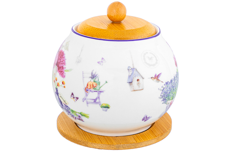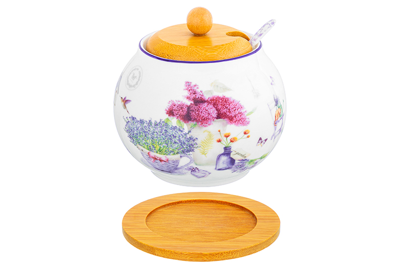 Сахарница 620 мл 11*11*12 см "Лаванда" + ложка + дер. крышка на дер. подставке NEW BONE CHINA