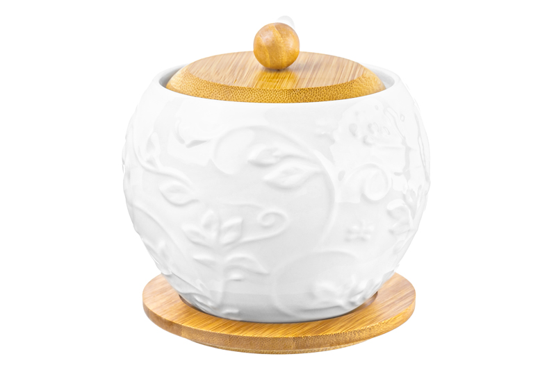 Сахарница серии "Птички на ветке" объемом 620 мл имеет деревянную крышку, фарфоровую ложку и деревянную подставку. Подойдет для хранения и красивой подачи сахара, меда, чая и многих других продуктов. Набор выполнен из высококачественного фарфора и натурального бамбука. Сахарница украшена рельефными изображениями птичек и растительными орнаментами. У сахарницы широкое горло, которое удобно мыть, а бамбуковая крышка не позволит сахару намокнуть. Деревянные детали набора нельзя использовать в микроволновой печи и посудомоечной машине. Размер набора 12х12х12 см. Поставляется в яркой картонной упаковке. Сахарница из серии посуды "Птички на ветке" сможет стать настоящим украшением кухни или приятным подарком для ваших родных и близких!