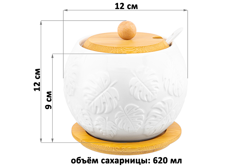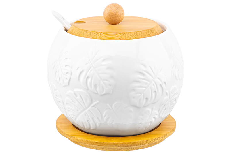 Сахарница Elan Gallery "Тропики" объёмом 620 мл выполнена из белого фарфора с рельефными узорами в виде листьев. Баночка имеет в комплекте фарфоровую ложку. Крышка и подставка изготовлены из натурального бамбука. Красивая ёмкость подойдёт для хранения сахара, а также других продуктов, таких как варенье, мёд, орехи и даже икра. Фарфоровая баночка с ложечкой станет отличным элементом декора вашей кухни и поможет хранить любые сыпучие продукты! Подойдёт для хранения специй, приправ или соли, чтобы во время приготовления пищи все было под рукой. Фарфоровую ёмкость можно использовать как медовницу, а так же для мармелада или конфет. Без бамбуковых деталей фарфоровую посуду можно использовать в посудомоечной машине. Изделия из бамбука нельзя замачивать. Набор поставляется в стильной картонной упаковке. Подарочная фарфоровая баночка порадует ваших близких на любой праздник. Станет чудесным подарком для любителей посуды в классическом стиле. Кухонный инвентарь с рельефным рисунком в виде листиков станет незаменимым помощником при сервировке стола и предметом декора вашего дома!