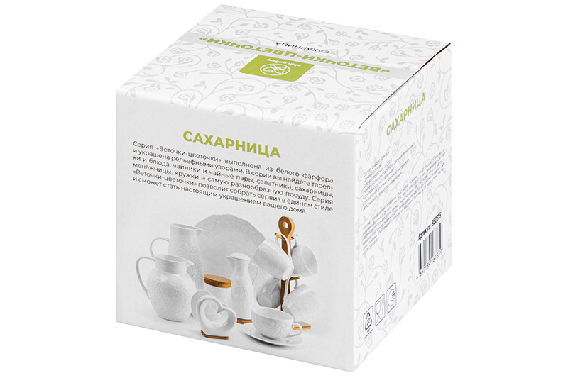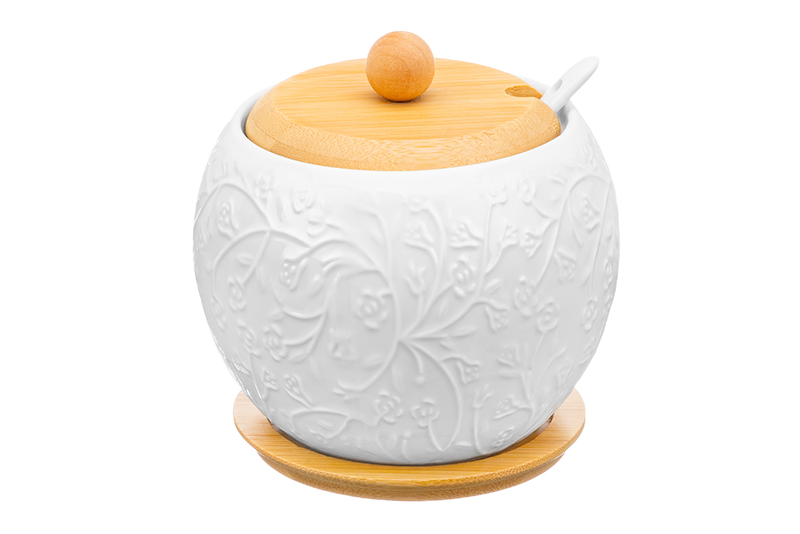 Сахарница Elan Gallery "Веточки-цветочки" объёмом 620 мл с ложкой выполнена из белого фарфора и украшена изящным рельефным узором. Размер круглой подставки – 10х10х1 см. Крышка и подставка баночки выполнены из натурального бамбука. Ёмкость подойдёт для хранения сахара, а также других продуктов, таких как варенье, мёд и даже икра. Фарфоровая баночка с ложечкой станет отличным элементом декора вашей кухни! Можно использовать для хранения специй и приправ, чтобы во время приготовления пищи все было под рукой. Без бамбуковых крышки и подставки можно использовать в микроволновой печи и посудомоечной машине. Изделия из бамбука нельзя замачивать! Поставляется в стильной картонной упаковке. Подарочная фарфоровая баночка порадует ваших близких на любой праздник. Кухонный инвентарь с рельефным рисунком станет незаменимым помощником при сервировке стола и предметом декора вашего дома!