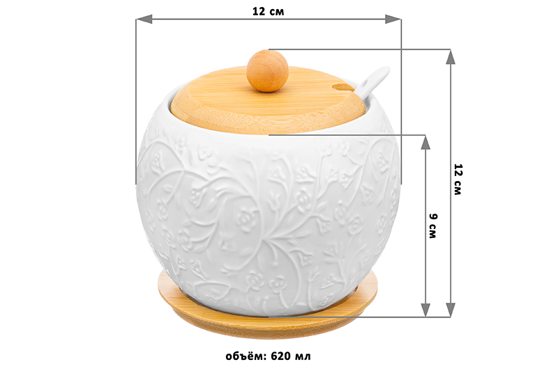 Сахарница 620 мл 12*12*12 см "Веточки-цветочки"+ ложка + дер.крышка на дер. подставке