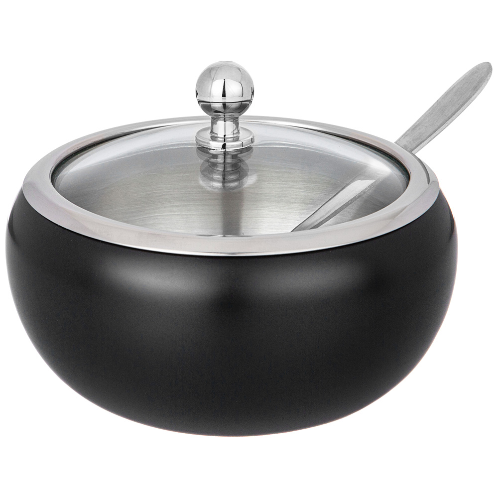 Сахарница выполнена из нержавеющей стали и имеет ложечку для насыпания, которая располагается в выемке на корпусе сахарницы.