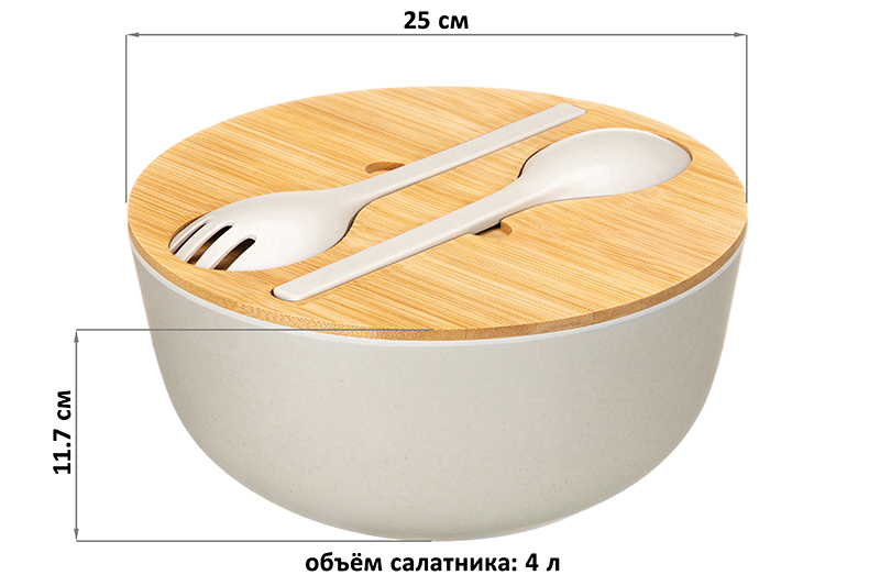 Салатник от бренда Elan Gallery светло-серого цвета выполнен из прессованного бамбука. Размер 25х25х11,7 см, объём 4 литра. Размер без крышки 25х25х11,2 см, диаметр дна 15 см. Салатная миска имеет бамбуковую крышку с фигурными отсеками для хранения ложки и вилки. Вилочка и ложечка для размешивания идут в комплекте к блюду, изготовлены из бамбукового волокна. Большую ёмкость можно использовать как домашнюю утварь на кухне, а также как походную. Посуда из прессованного бамбука изготовлена по особой технологии, поэтому имеет лёгкий вес и высокую прочность. Бамбуковая чаша с крышечкой – это стильно и экологично! Набор из глубокой тарелки и столовых приборов для смешивания не впитывает запах продуктов и не выделяет вредных веществ. Положите в тазик фрукты или сделайте салатик, чтобы перекусить на природе. Благодаря столовым приборам вы можете наслаждаться свежим салатом даже в походе. Большой объём контейнера и приборы в комплекте позволят удобно смешивать ингредиенты. Можно использовать для подачи и сервировки овощей и фруктов в роли фруктовой вазы. Не рекомендуется применять абразивные моющие средства. Не использовать для хранения жидкостей. Не нагревать и беречь от открытого огня. Нельзя использовать в посудомоечной машине и микроволновой печи. Сервировочная миска легко моется вручную. Бамбук нельзя замачивать. Станет полезным подарком на любой праздник, потому что всегда пригодится дома, на даче или пикнике. В коллекции бренда Элан Галерея представлено много стильных товаров для дома, в том числе функционального кухонного инвентаря. Выберите красивые кухонные аксессуары на свой вкус.