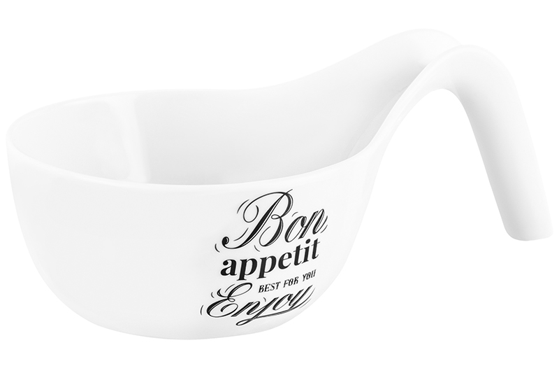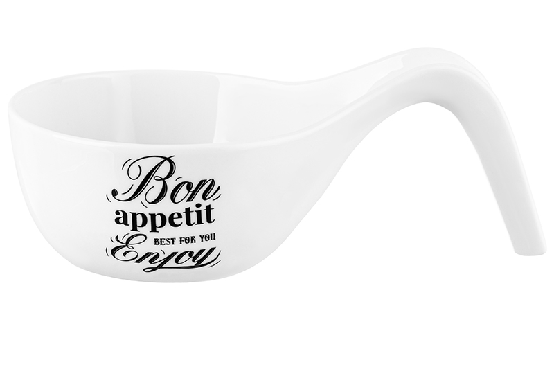 Салатник-супница от Elan Gallery «Bon Appetit» размером 23,5х14,5х9 см выполнен из белого фарфора. Имеет удобную ручку. Объём ёмкости – 600 мл. «Bon Appetit» – это коллекция фарфоровой посуды в стиле френч-винтаж, которая создаст на вашей кухне атмосферу романтики и уюта. Глубокая суповая тарелочка украшена лаконичными надписями чёрного цвета, стилизованными под ретро. Чёрно-белая обеденная посуда впишется в любой интерьер кухни или столовой, а также придаст элегантности вашему столу. Круглую тарелку можно использовать как супницу, салатник или сервировочное блюдо. Она станет незаменимым предметом для сервировки каши на завтрак, а в обед подойдёт для супа, бульона или окрошки. Благодаря глубокой форме блюдо станет незаменимым помощником для подачи плова или гарниров: лапши, гречки и риса с овощами. За счёт высоких стеночек удобно для смешивания ингредиентов. Возьмите его на дачу, чтобы приспособить как фарфоровую миску для ягод или вазочку для конфет. Используйте за просмотром любимых фильмов как мисочку под снеки и чипсы! В отличие от керамики фарфор не впитывает цвет и запах продуктов. Готовьте салаты из таких овощей, как свекла и морковь, фарфоровая поверхность чаши легко отмывается! Не рекомендуется применять абразивные моющие средства. Можно использовать в микроволновой печи и мыть в посудомоечной машине. Бульонница поставляется в стильной картонной коробке. Эта тарелка станет отличным подарком на праздник для тех, кто ценит стильную сервировку. Благодаря красочной коробочке вам не понадобится дополнительная подарочная упаковка. В коллекции бренда Elan Gallery представлено много товаров для дома и красивого кухонного инвентаря. Здесь можно найти сервировочные блюда и конфетницы на любой вкус!