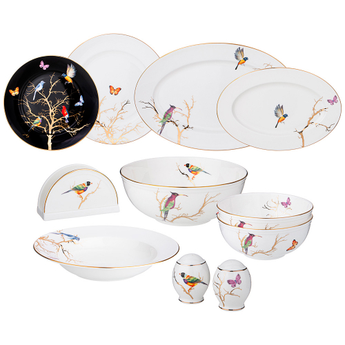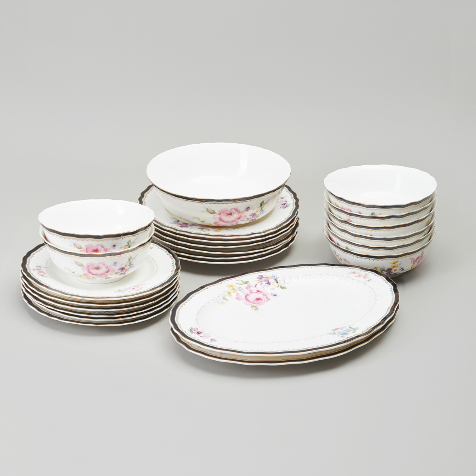 Комплектность: обеденная тарелка 25,5 см 6 шт., закусочная тарелка 21 см 6 шт., суповая тарелка - салатник 17,5*5,5 см 700 мл 6 шт., блюдо овальное 32,5*22,5*2,5 см 2 шт., салатник 22,5*7 см 1650 мл, салатник 15*6 см 630 мл 2 шт.