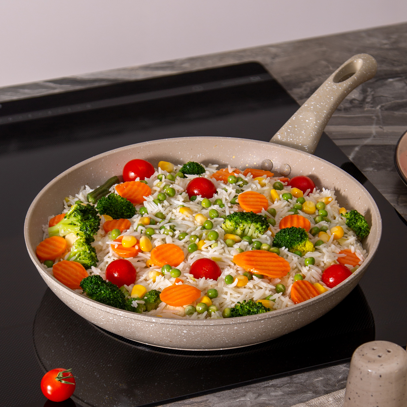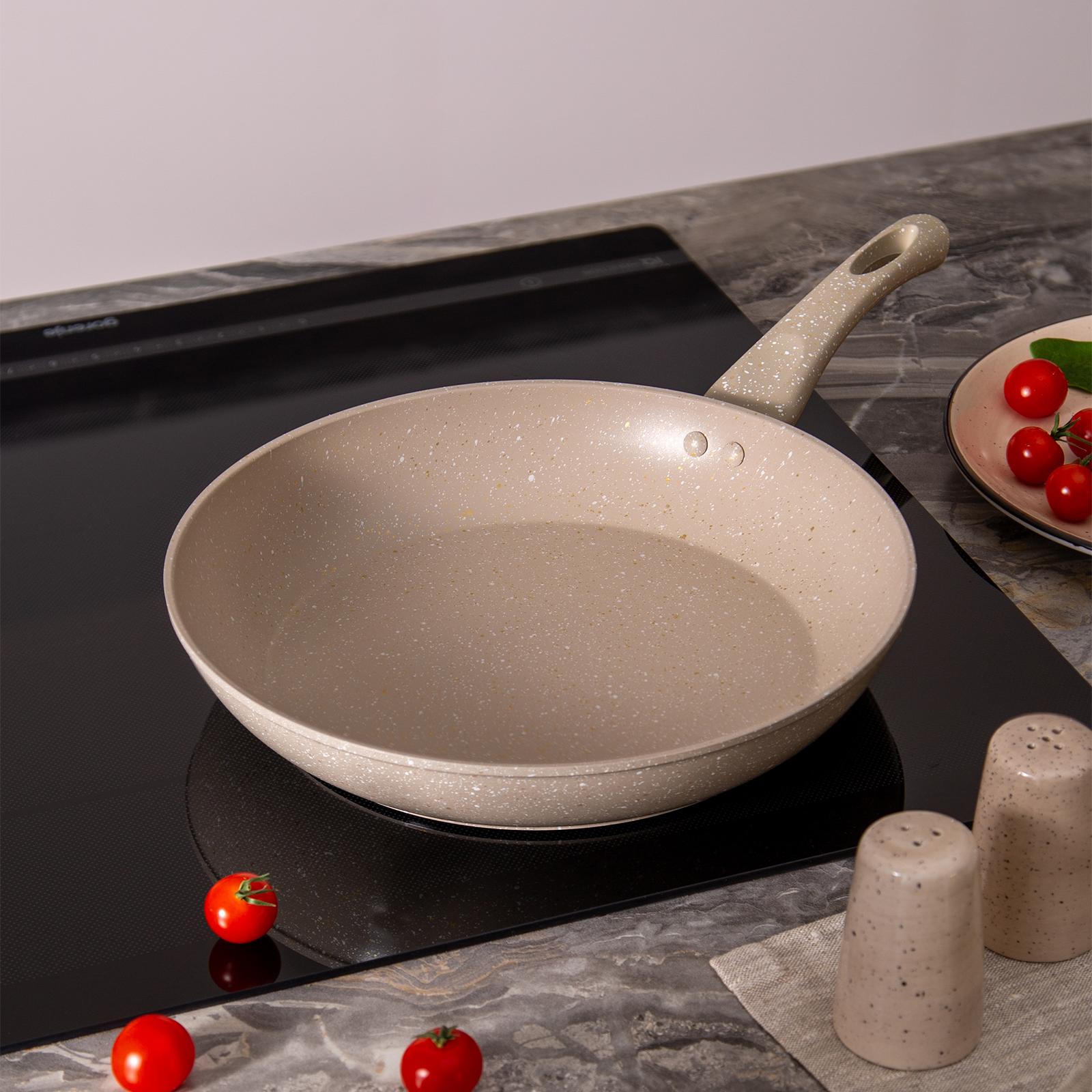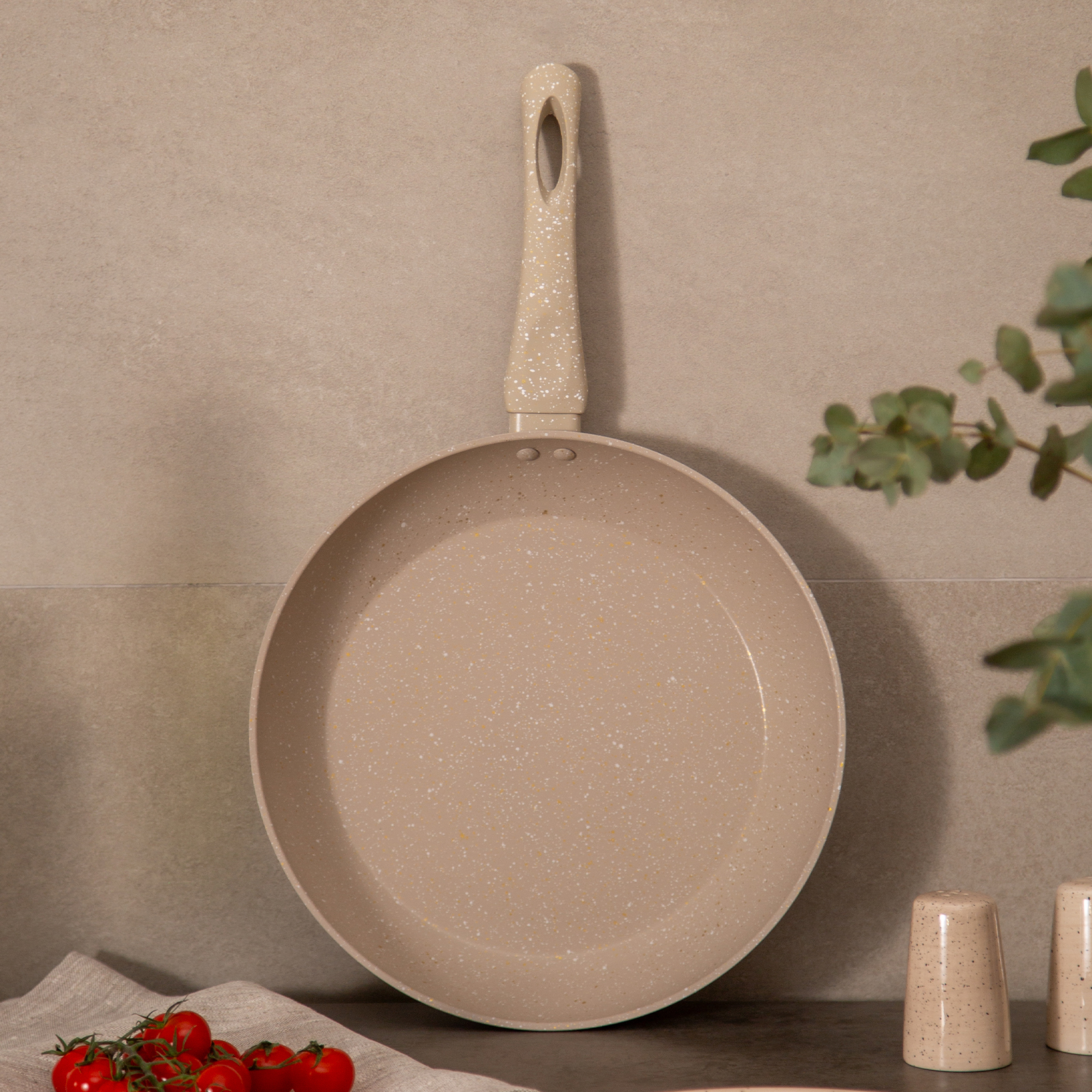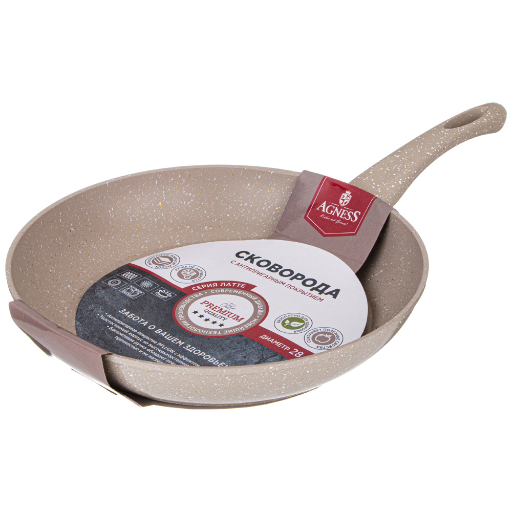 СКОВОРОДА AGNESS С АНТИПРИГАРНЫМ ПОКРЫТИЕМ "LATTE" - это идеальный выбор для тех, кто ценит удобство и функциональность в посуде. Одним из главных достоинств этой сковороды является ее антипригарное покрытие, которое позволяет готовить без использования большого количества масла, а также обеспечивает равномерное распределение тепла. Благодаря этому, продукты готовятся быстрее и сохраняют свои полезные свойства.Быстрое нагревание сокращает время приготовления и сохраняет вкус и аромат продуктов. Многослойная структура покрытия обеспечивает превосходные эксплуатационные качества и увеличивает срок службы, не содержит PFOA.Эргономичная ручка из бакелита с мягким покрытием SOFT TOUCH не нагревается и не плавится, обеспечивает безопасное использование сковородки в процессе приготовления пищи. Посуда AGNESS - это современный дизайн и новейшие технологии производства.
