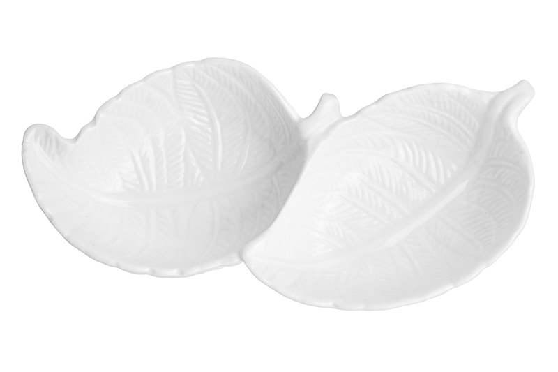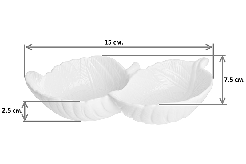 Соусник "Листок" состоит из двух секций объемом 50 мл каждая. Соусник в форме листочков выполнен из качественного фарфора с рельефным рисунком. Соусник можно использовать для сервировки соусов и специй.