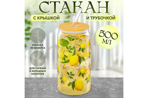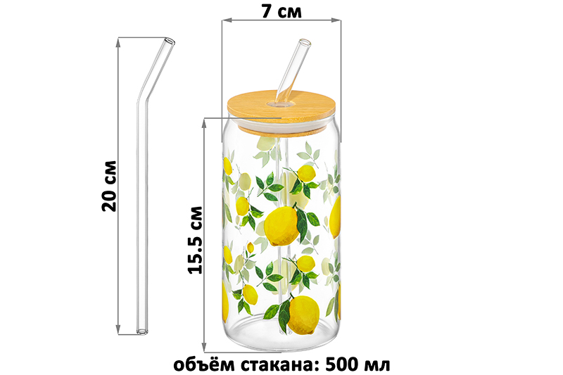 Стакан 500 мл 7*7*15,5 см "Лимоны" с деревянной крышкой и трубочкой, стекло