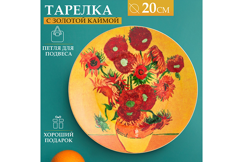 Декоративная тарелка круглой формы "Подсолнухи" с золотой каймой от Elan Gallery выполнена из фарфора и станет настоящим украшением любого пространства! Диаметр фарфорового изделия 20 см. Имеет в комплекте пластиковую подставку. Украшена рисунком с букетом цветов по мотивам шедевров мировой живописи знаменитого художника Ван Гога. На фарфоровой тарелочке с росписью есть крючок для подвешивания на стену, чтобы использовать её в роли настенного панно. Благодаря подставочке в наборе вы можете разместить её на полке или столе, чтобы украсить интерьер кухни, столовой или любой комнаты. Можно использовать как настенную, так и настольную. Такой предмет декора с принтом не займёт много места, как картина, но добавит вашей квартире или даче красоты и уюта. Не предназначается для приёма пищи. Не рекомендуется применять абразивные вещества, нельзя замачивать. Для очистки поверхности протрите изделие влажной тряпочкой. Поставляется в картонной коробке. Станет чудесным подарком для мужчин или женщин. Благодаря красочной коробочке вам не понадобится дополнительная подарочная упаковка! В коллекции бренда Elan Gallery можно найти много красивой посуды, сувениров и функциональных товаров для дома, чтобы создать комфортную и уютную атмосферу для всей семьи! Украсьте свой дом и почувствуйте атмосферу праздника даже в самый обычный день! /