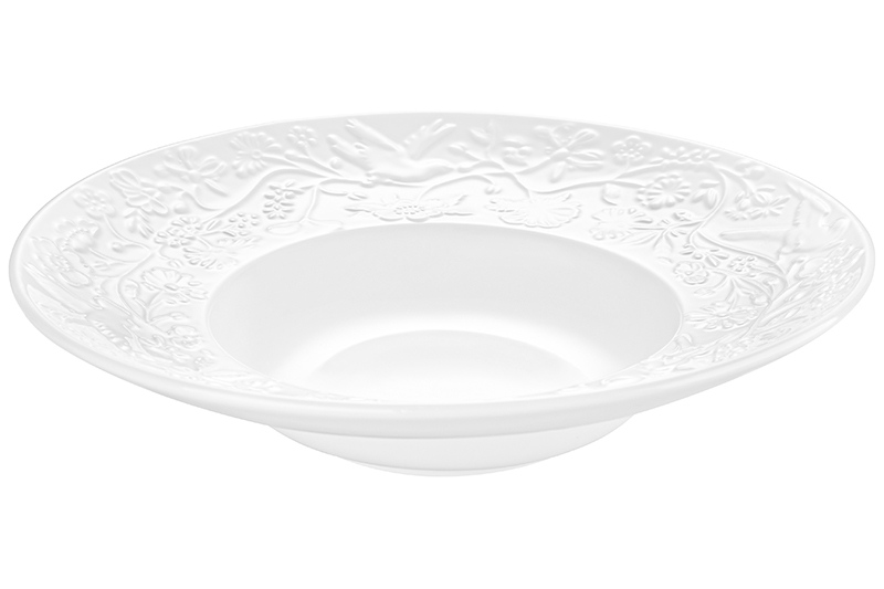 Тарелка Elan Gallery "Райский сад" размером 25х25х5,5 см выполнена из белого фарфора. Посуда серии украшена изящным рельефным узором в виде птиц в цветущем саду. Глубокая круглая тарелочка подойдёт для подачи супов, бульонов и каш. Эргономичная форма посуды позволяет использовать её также для любых блюд: рагу, салатов, пасты. Блюдо подойдёт для сервировки как на праздник, так и в будни. Избегать резких перепадов температур и беречь от механических повреждений. Не рекомендуется применять абразивные моющие средства. Суповую тарелку можно использовать в микроволновой печи и мыть в посудомоечной машине. Поставляется в картонной коробке. Эта обеденная тарелочка станет отличным подарком для любой хозяйки, которая ценит стильную сервировку. Благодаря стильной коробочке не потребуется подарочная упаковка. Понравится любителям посуды в скандинавском стиле. Серия «Райский сад» позволит собрать сервиз в едином стиле и сможет стать настоящим украшением вашего дома.