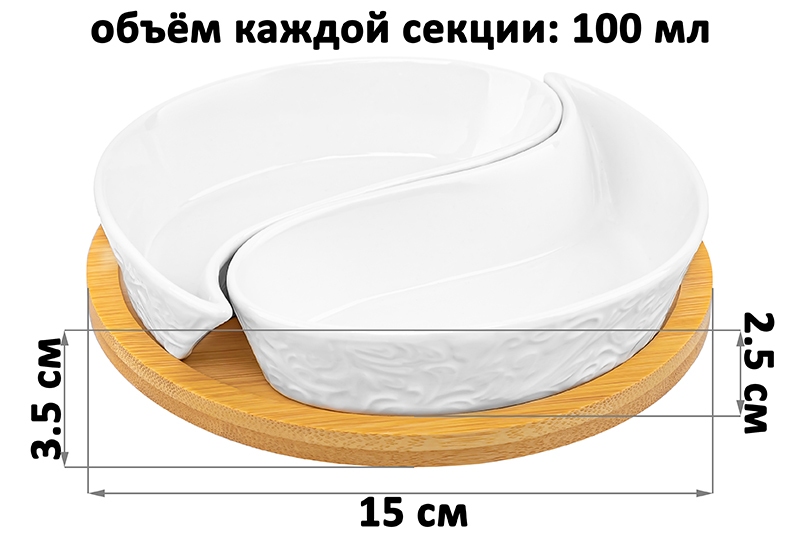 Тарелка под оливки «Инь-Янь» из серии «Лоза» на деревянной подставке от Elan Gallery подойдёт для сервировки закусок. Общий размер изделия – 15х15х3,5 см. Размер каждой ёмкости – 14х7х2,5 см, объём – 100 мл. Выполнена из высококачественного белого фарфора. Он не впитывает цвет продуктов и легко отмывается, благодаря чему надолго сохранит свою белизну. Поверхность изделия украшает рельеф в виде тонкой, элегантной лиственной лозы. Подставка выполнена из натурального бамбука. С маленькой менажницей вы сможете красиво подать маслины, орехи или сыры. Она послужит и в качестве небольшой конфетницы, поможет угостить себя и гостей любимыми сладостями за праздничным столом. Не рекомендуется применять абразивные моющие средства. Без бамбуковой подставки подходит для использования в посудомоечной машине и микроволновой печи. Бамбук нельзя замачивать! Поставляется в дизайнерской картонной коробке – благодаря ей вам не потребуется дополнительная подарочная упаковка. Фарфоровая сервировочная посуда послужит оригинальным подарком для хозяйки, ценящей не только практичность, но и привлекательность. Серия «Лоза» от бренда Элан Галерея станет украшением любого кухонного инвентаря и позволит собрать сервиз в едином стиле!
